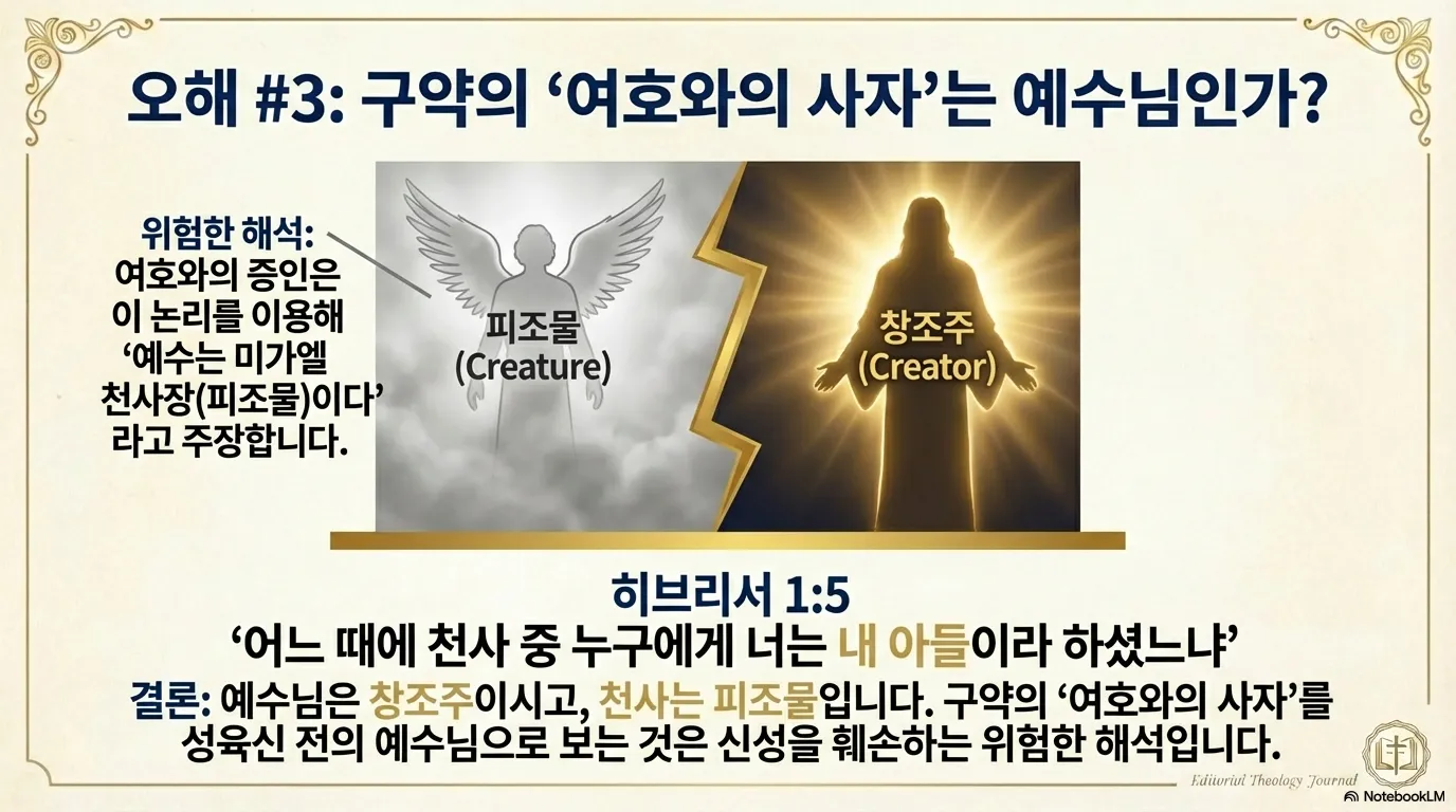 그러나 이것은 매우 위험한 해석이 될 수 있다. 왜냐하면 여호와의 증인 같은 이단은 바로 이 논리를 이용해 "예수는 미가엘 천사장이다. 그러므로 예수는 피조물이다"라고 주장하기 때문이다. 그러므로 만약 우리가 구약의 여호와의 천사를 예수님과 동일시하면, 예수님의 신성을 훼손할 여지를 갖게 된다. 히브리서 1장은 분명히 말씀한다. "어느 때에 천사 중 누구에게 너는 내 아들이라 하셨느냐"(히 1:5)라고 반문하면서, 예수님과 천사를 철저히 구분하고 있다. 예수님은 창조주이시고, 천사는 피조물인 것이다.