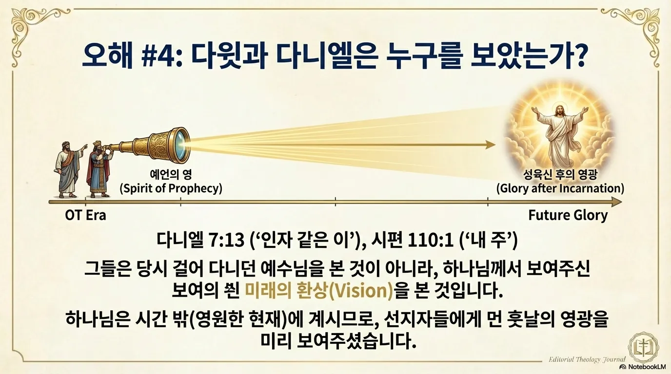 그럼, 마지막 의문이 남는다. 구약시대에 예수님을 본 자들이 있기 때문이다. 예를 들어보자. 다니엘과 같은 선지자는 "인자 같은 이가 하늘 구름을 타고 와서 옛적부터 항상 계신 이에게 나아가 권세를 받더라"(단 7:13)는 환상을 보았다. 다윗도 시편 110편 1절에서 "여호와께서 내 주에게 말씀하시기를 내가 네 원수들로 네 발판이 되게 하기까지 너는 내 오른쪽에 앉아 있으라 하셨도다"라고 말하면서 그가 '내 주'이신 예수님을 보았음을 증언하고 있다. 그렇다면 이것은 구약 시대에 예수님이 활동하셨음을 증언하는 것이 아닌가?