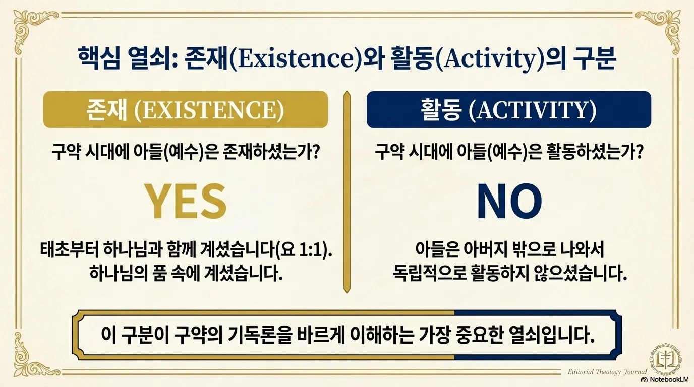 그렇다면 구약시대에 아들은 어디에 계셨는가? 이 문제를 해결하기 위해서는 우리가 알아야 할 사실은 그분의 '존재(Existence)'와 '활동(Activity)'을 명확히 구분하는 것이다. 이것이 구약의 기독론을 바르게 이해하는 핵심 열쇠가 된다.