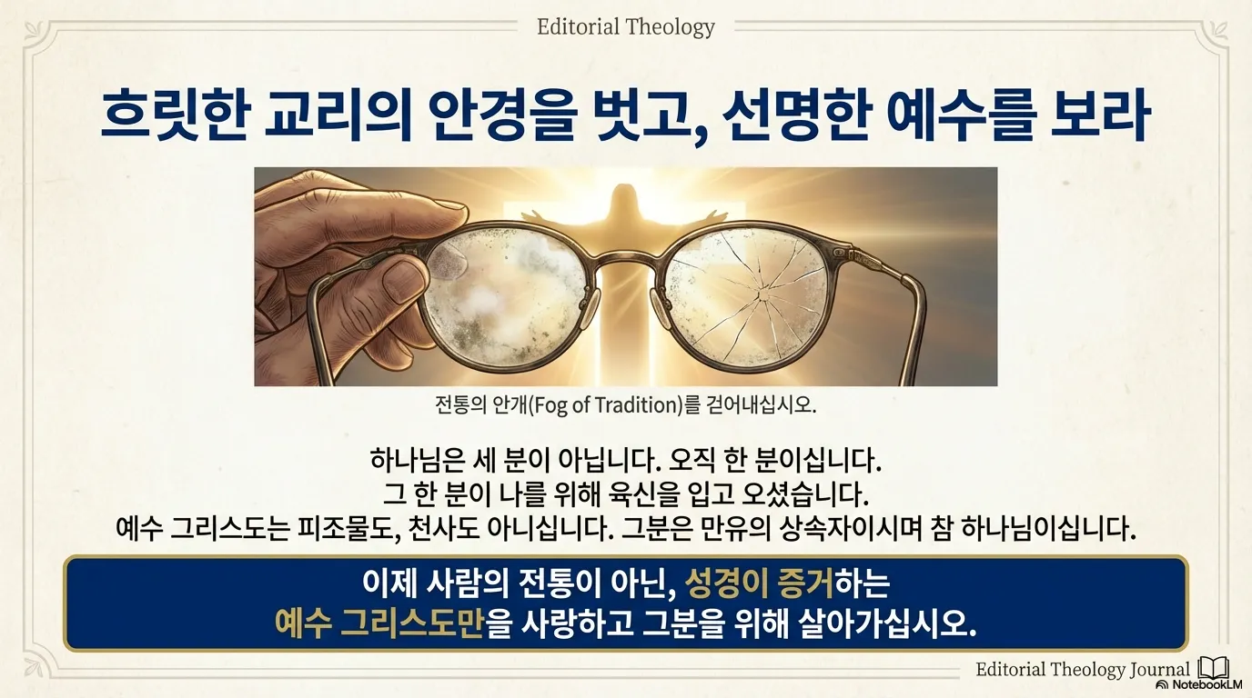 이제 흐릿한 교리의 안경을 벗고, 성경이 증거하는 선명한 예수 그리스도를 바라보자. 한 분이신 하나님, 나를 위해 육신을 입고 오신 그 예수님만을 사랑하고 그분을 위해 살아가는 저와 여러분이 되기를 주님의 이름으로 간절히 바란다.