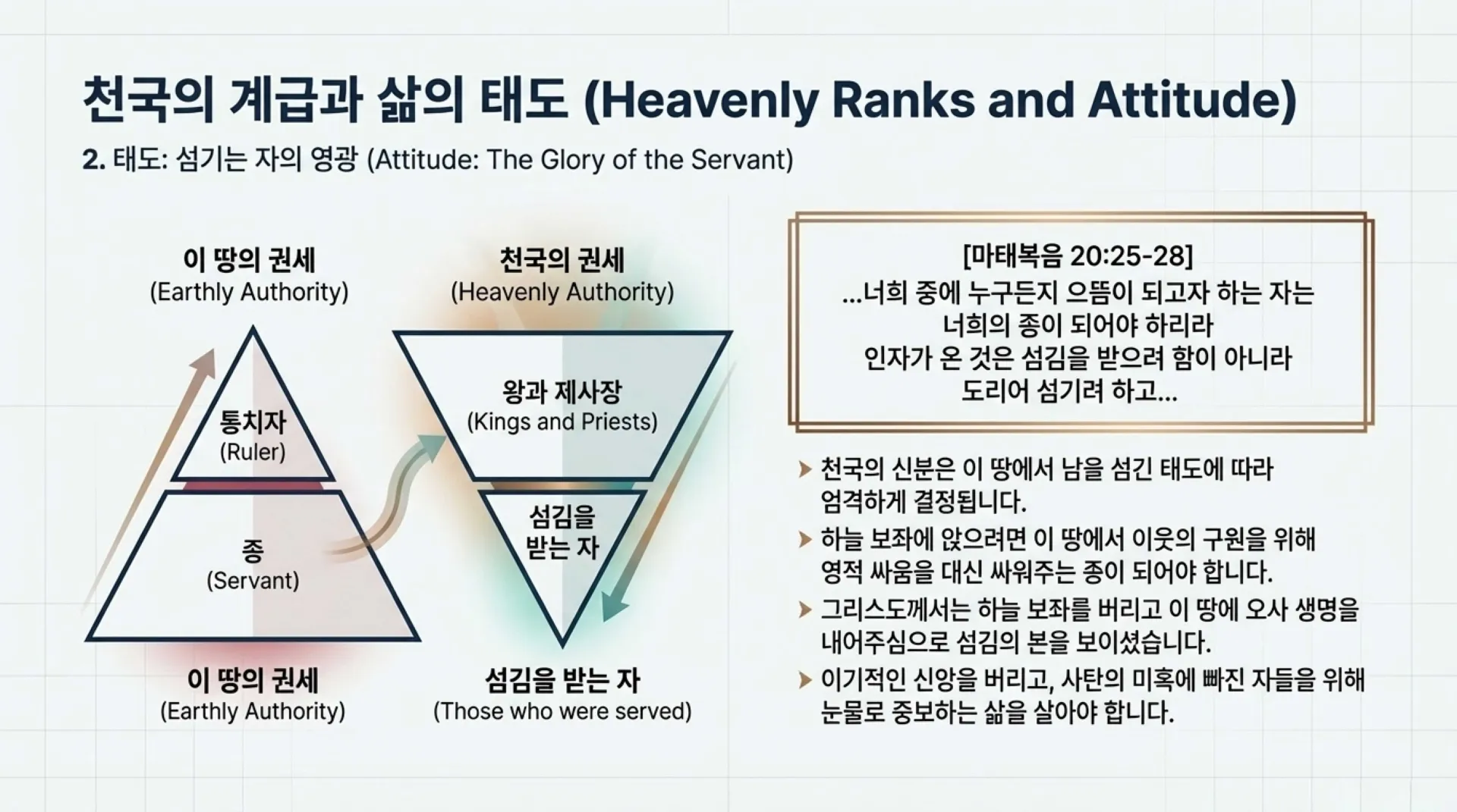 천국의 신분은 이 땅에서의 삶의 태도에 따라 '섬김을 받는 자(왕과 제사장)'와 '섬기는 자(종)'로 엄격하게 나뉜다. 예수님의 제자들이 서로 누가 크냐며 다툴 때, 주님은 이방인의 집권자들처럼 권세를 부리려 하지 말고 오히려 형제를 섬기는 종이 되라고 역설하셨다(마 20:25~28).