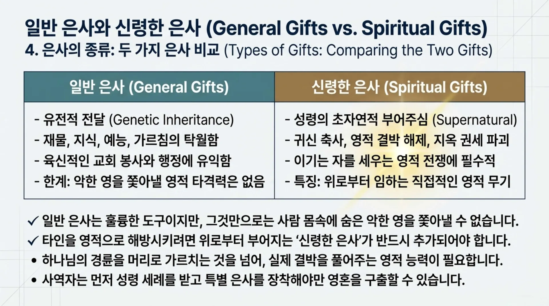 4. 부모로부터 물려받는 '일반 은사'와 성령께서 부어주시는 '신령한 은사(특별 은사)'의 차이는 무엇이며, 왜 신령한 은사가 반드시 필요한가?