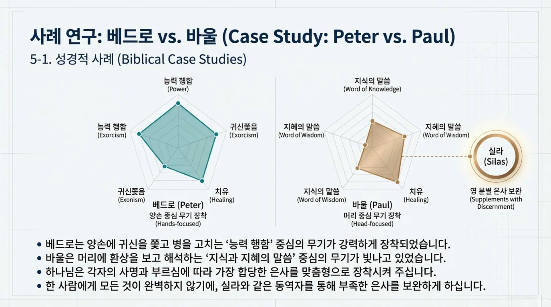 반면 바울 사도의 경우는 조금 달랐다. 그의 머리에는 '지식의 말씀의 은사'(환상을 보는 것)와 '지혜의 말씀의 은사'(영을 보고 환상을 본 후에 그 의미가 무엇인지를 읽어내는 것)가 1번으로 빛나고 있었으며, 동시에 일반 은사로서 말씀을 잘 배우고 익히는 '지식의 은사'와 더불어 그것들을 잘 활용할 수 있는 '지혜의 은사' 그리고 '사랑의 은사'도 함께 자리잡고 있었다. 다만 바울은 '영 분별의 은사'나 '영 판단의 은사' 그리고 '귀신쫓음의 은사'는 상대적으로 약했기에, 하나님은 그 빈틈을 메우기 위해 영 분별과 영판단의 은사가 탁월했던 선지자 실라를 2차 전도 여행의 동역자로 붙여주셨다.(실제로 빌립보에서 점치는 여종의 귀신을 쫓아낼 때 실라의 영적 분별이 큰 역할을 감당했다.) 이처럼 하나님은 사명자의 부르심에 따라 그리고 감당할 사역에 따라 영적 신체의 각 부위에 가장 합당한 신령한 은사의 빛을 무기로 장착시켜 주시는 것이다.