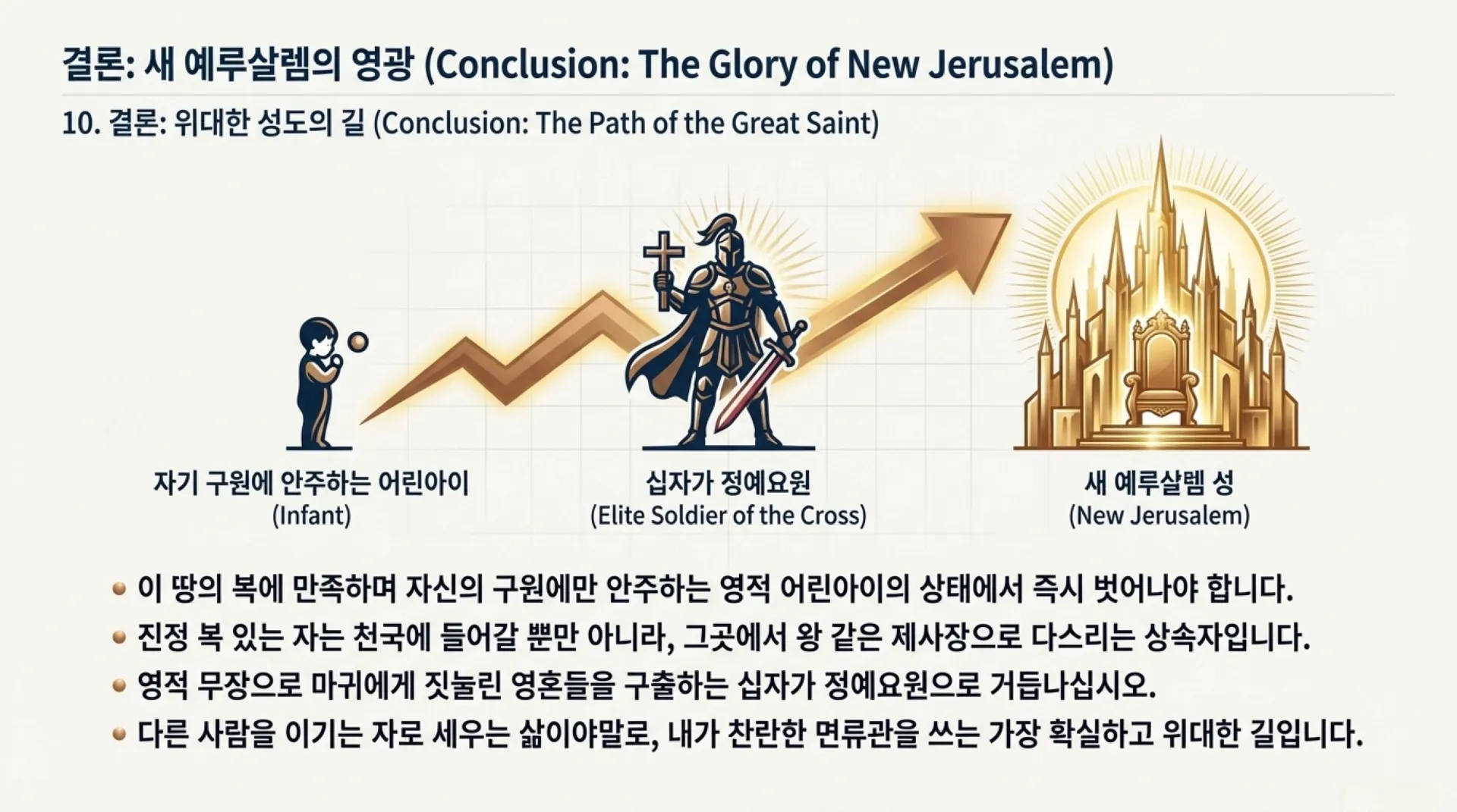 성도들과 목회자들과 선교사들이여, 이제는 자기 자신의 구원과 평안에만 안주하는 영적 어린아이 범주에서 빨리 벗어나기를 바란다. 주님이 오실 날이 얼마 남지 않았는데 언제까지 미적미적할 것인가? 그렇다면 우리는 무엇부터 시작해야 하는가? 그것은 가장 먼저 나의 죄를 철저히 회개함으로 깨끗한 그릇이 되는 것이다.  이게 가장 중요하다. 그리고 회개하면서 틈틈히 하나님의 구원 경륜과 영적 세계의 실상을 배워나가야 한다. 아니 배우기에 힘써야 한다. 그리고 더욱 더 나아가서는 자신이 부모로부터 받은 일반 은사를 활성화시켜 교회를 섬길 뿐만 아니라, 성령의 신령한 은사들로 장착하여 하나님의 뜻과 경륜을 실제로 이뤄나가야 한다. 곧 할수만 있다면, 먼저는 빛의 은사 계열로서, 영들분별의 은사, 영판단의 은사, 지식의 말씀의 은사, 지혜의 말씀의 은사를 장착해야 한다 그리고 불의 은사 계열로서, 성령의 불과 검을 같이 장착해야 한다. 이러한 은사들은 주의 나라의 건설을 위해 이 땅에 보내어진 주님의 참된 사역자들을 통해 전수(임파테이션)받아야 한다. 그리고 이미 있던 은사는 깨워서 더욱 활활 타오르게 만들어, 지금이라도 활용가능한 영적 무기들로 장착시켜야 한다. 그리하여 마침내는 마귀에게 짓눌린 영혼들을 구출해 내어 천국으로 입성하게 해주는 십자가 정예요원으로 쓰임 받아야 한다. 그러다가 잠시 후에 다가올 새 예루살렘 성 안으로 들어가, 그곳에서 찬란한 면류관을 쓰고 영원토록 왕 노릇 하는 위대한 성도들이 되어야 한다.