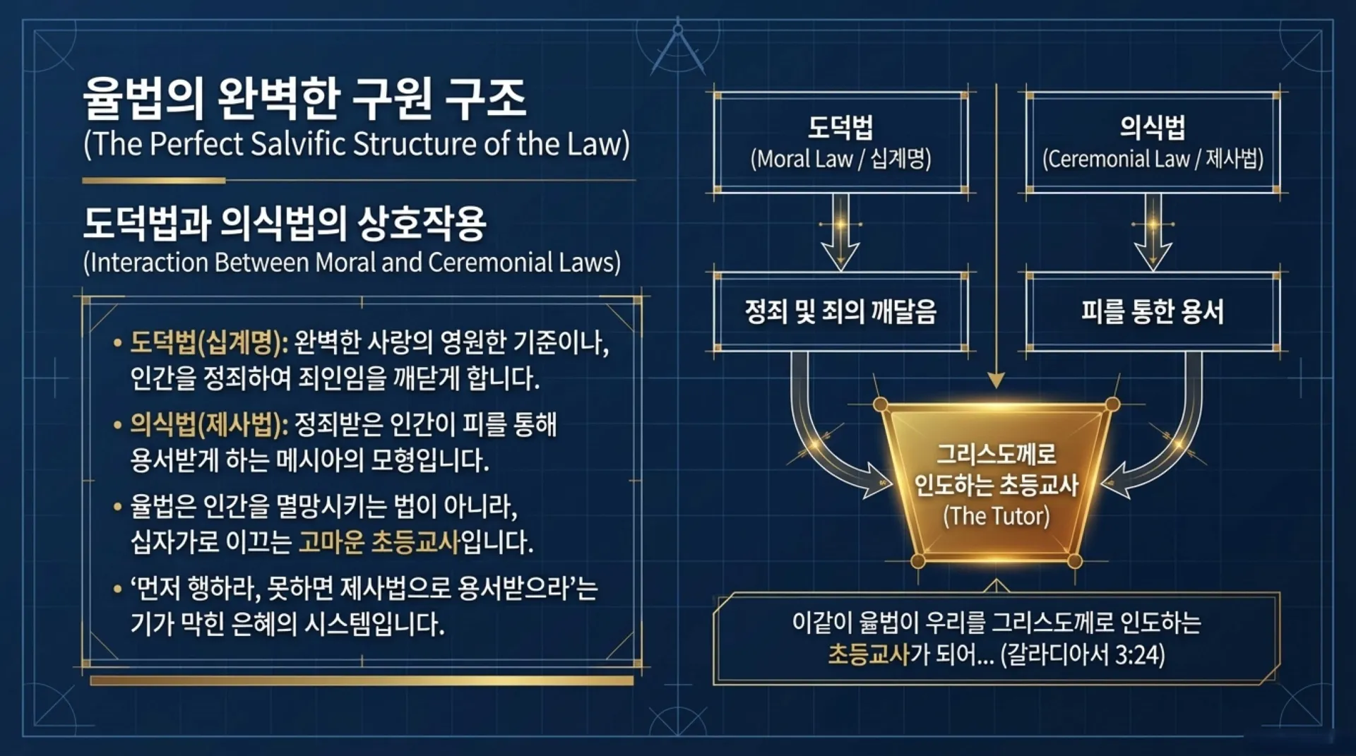 4. 율법을 도덕법과 의식법으로 구분할 때, 율법이 우리를 구원으로 인도하는 완벽한 구조는 어떻게 이루어져 있는가?