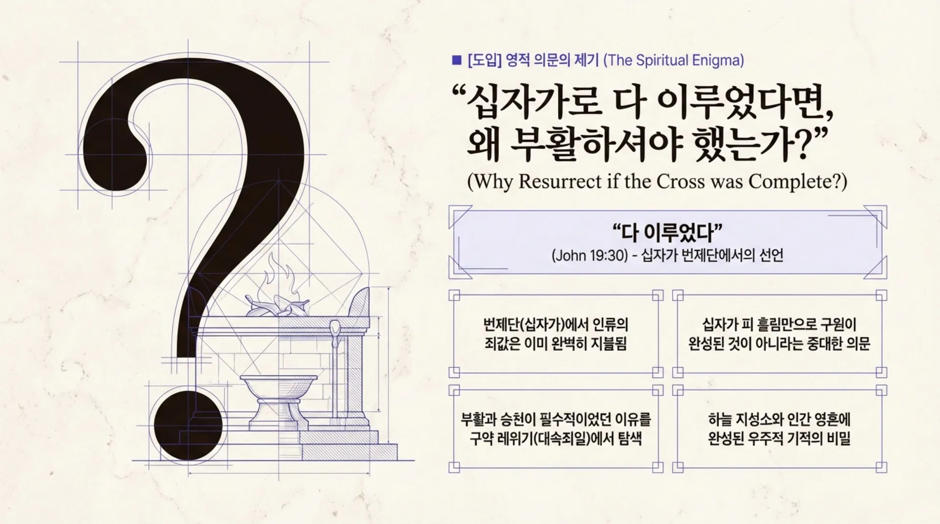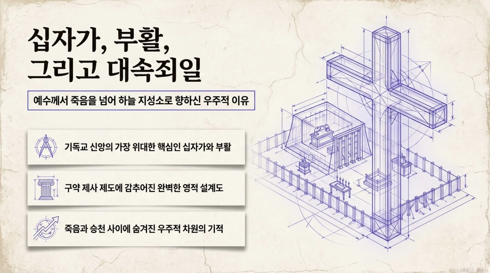 그러나 우리는 여기서 매우 중대한 영적 의문에 직면하게 된다. 만약 예수님이 십자가의 번제단에서 인류의 속죄를 위한 모든 값을 완벽하게 지불하셨다면, 왜 굳이 죽은 자 가운데서 다시 살아나셔야만 했으며, 부활하신 이후에 하늘로 올라가셔야만 했는가? 십자가의 피 흘림만으로 구원이 완성된 것이 아니란 말인가? 이 심오한 비밀을 풀기 위해서는 구약 레위기에 기록된 대속죄일 제사의 규례와 신약 히브리서의 증언을 짝을 지어 살펴보아야 한다. 예수님의 부활과 승천이 하늘 지성소와 우리의 영혼 깊은 곳에 어떤 우주적인 기적을 완성했는지, 그 감추어진 진리의 세계로 들어가 보자.