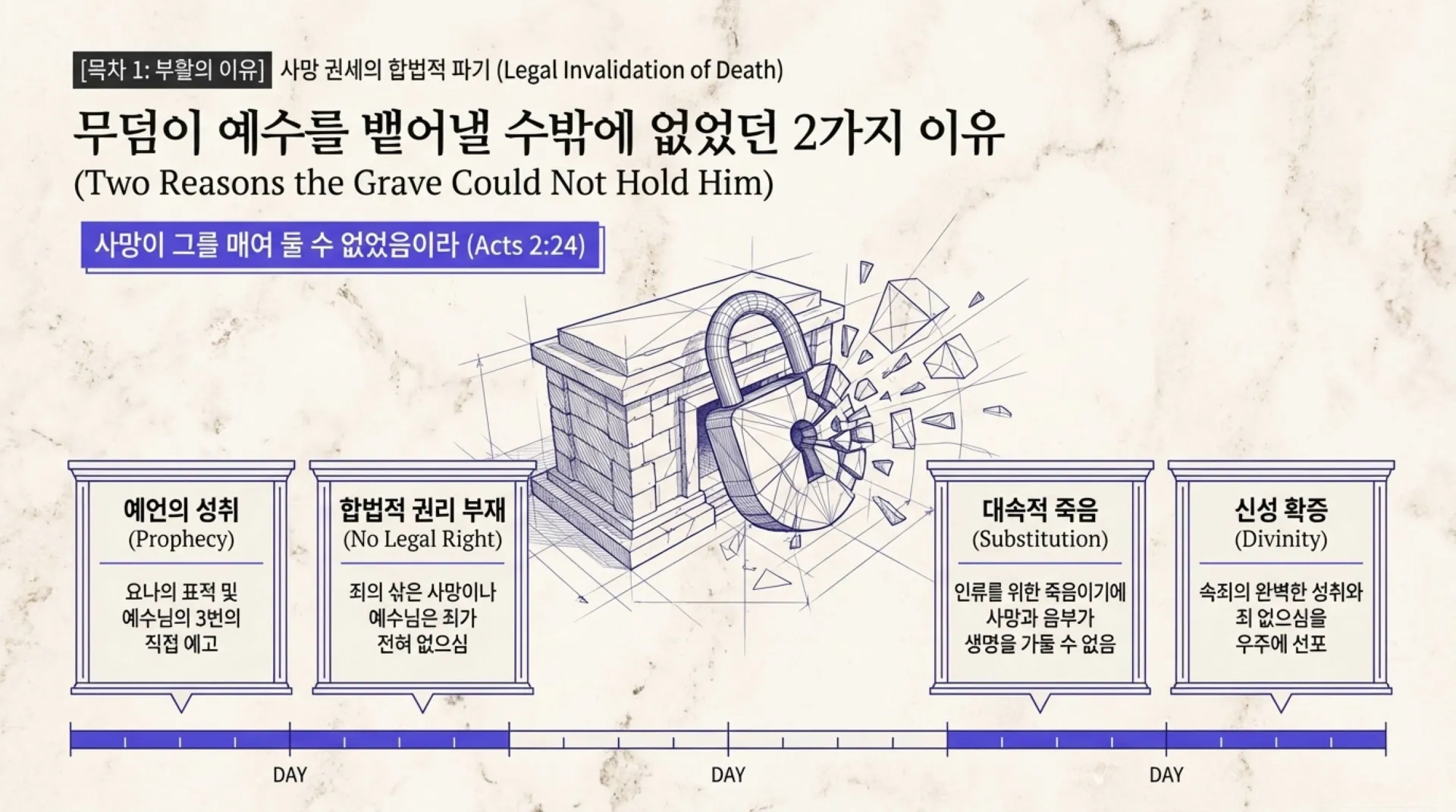 둘째, 예수님이 다시 살아나실 수 있었던 결정적인 이유는 사망과 음부가 그분을 계속해서 붙잡아 둘 합법적인 권리가 없었기 때문이다(행 2:24). 사람이 죄를 지으면 어떻게 되는가? 그 삯은 사망이다(롬 6:23). 그러면 사망 뒤에는 음부가 뒤따라오며 그 영혼을 낚아채간다(계 6:8). 인간은 아담의 원죄와 자범죄로 인해 모두 사망의 권세 아래 놓여 있다. 그러나 예수님은 죄가 전혀 없으신 분이다. 그러므로 예수께서 십자가에서 죽으신 것은 자신의 죄 때문에 죽으신 것이 아니라, 인류의 죄값을 대신 지불하기 위한 대속적인 죽음이었다. 예수님 자신에게는 사망이 왕 노릇 할 털끝만 한 죄의 근거도 없었기에, 무덤과 음부는 결코 그 생명을 가둬둘 수 없었고 결국 토해낼 수밖에 없었던 것이다.
