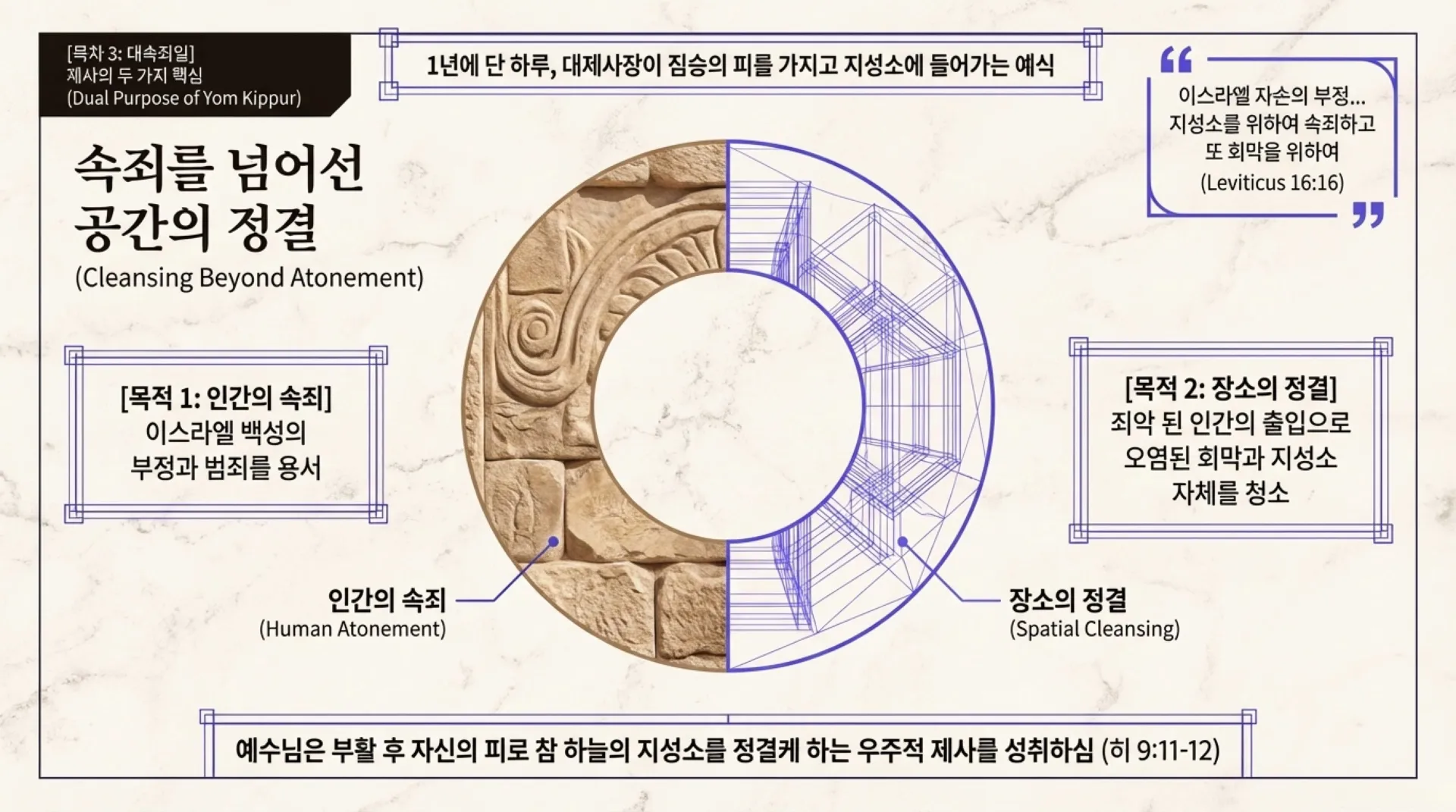 죄악 된 인간인 제사장들이 성소에 출입하며 드렸던 기도와 헌신에는 불순물이 섞여 있었고, 이로 인해 거룩한 회막과 분향단, 지성소가 오염되었다. 따라서 인간의 죄 사함을 넘어, 하나님과 만나는 그 거룩한 영적 공간 자체를 깨끗이 청소하는 정결 의식이 절대적으로 필요했던 것이다. 예수님은 골고다 언덕이라는 지상의 번제단에서 인류의 죄를 속량하셨다. 그리고 부활하신 후, 염소와 송아지의 피가 아닌 오직 자기의 피를 가지고 손으로 짓지 아니한 참 하늘의 지성소에 단번에 들어가셔서 더럽혀진 하늘의 영적 공간을 깨끗하게 정결케 하시는 우주적 대속죄일 제사를 완벽하게 성취하셨다(히 9:11-12).
