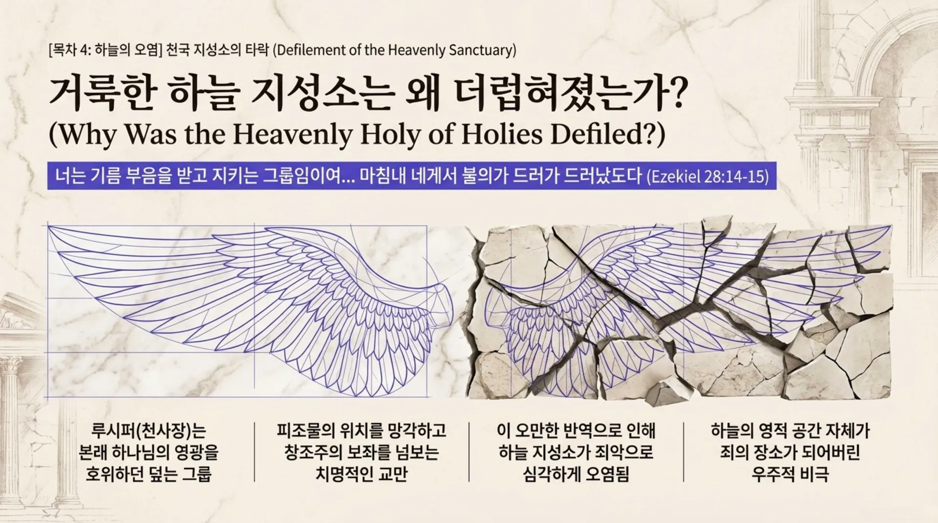 그렇다면 여기서 한 가지 근본적인 의문이 생긴다. 이 땅의 지성소가 인간의 죄로 더러워지는 것은 이해할 수 있으나, 어찌하여 거룩하고 흠 없는 하늘의 지성소가 더럽혀질 수 있다는 말인가? 하나님의 보좌가 있는 지성소가 어떻게 더럽혀질 수 있다는 말인가? 그 충격적인 해답은 에스겔서에 기록된 사탄 마귀, 즉 루시퍼의 타락 과정이 고스란히 기록되어 있다.