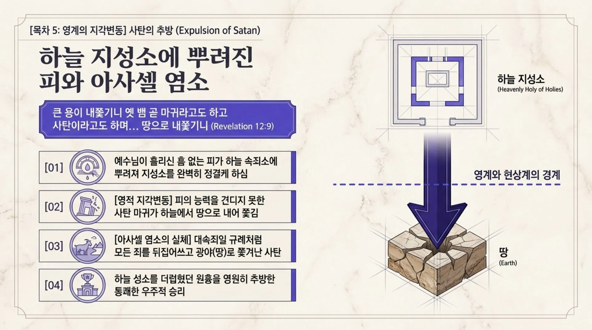 대속죄일 제사 규례를 보면 여호와를 위한 염소의 피를 지성소에 뿌린 후, 백성의 모든 죄를 아사셀 염소의 머리에 안수하여 산 채로 광야로 쫓아버리는 의식이 있다(레 16:21-22). 하늘 지성소에 피가 뿌려짐으로써, 인류를 타락시키고 성소를 더럽혔던 사탄(아사셀 염소의 실체)이 모든 죄를 뒤집어쓰고 하늘에서 땅으로 영원히 추방당하는 통쾌한 영적 승리가 완성된 것이다.