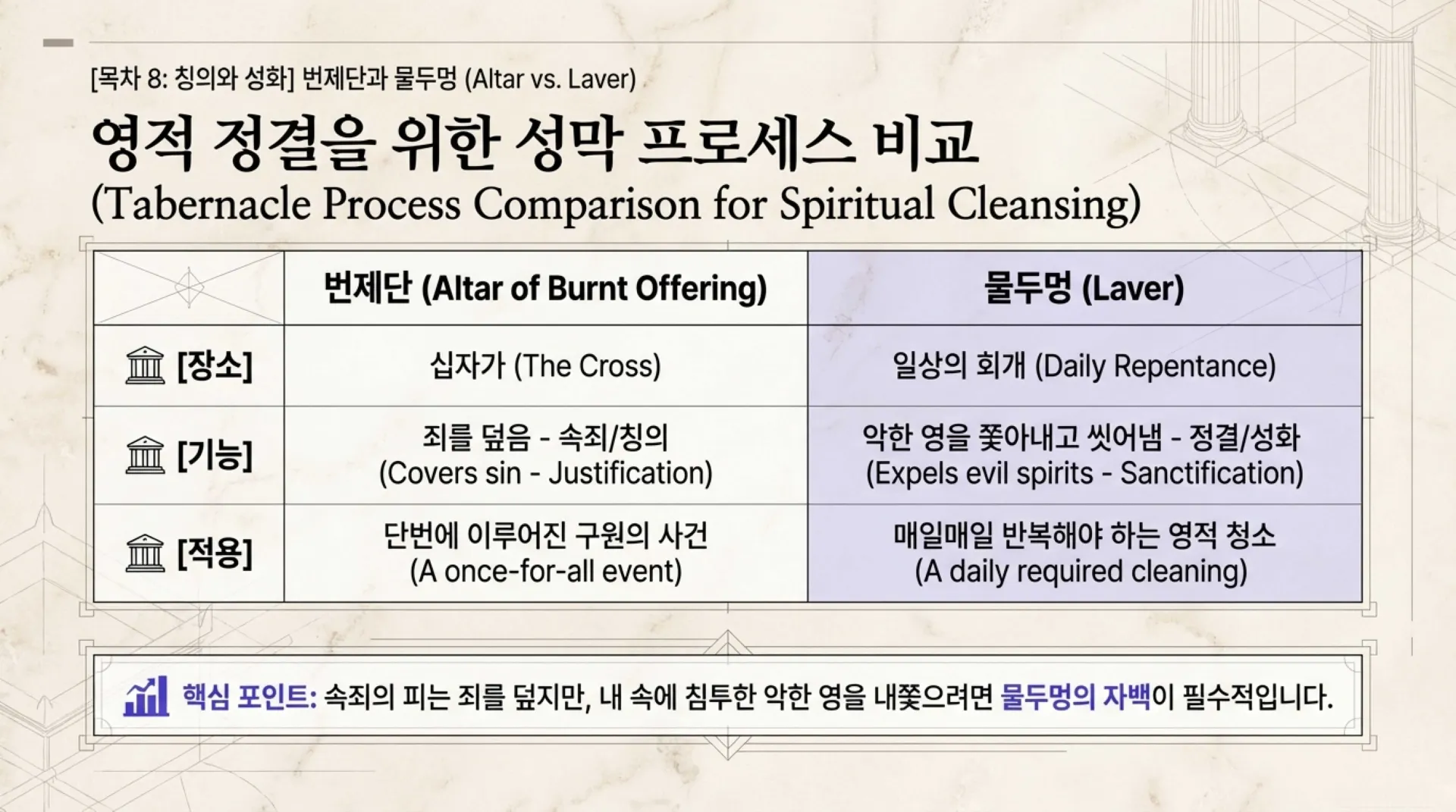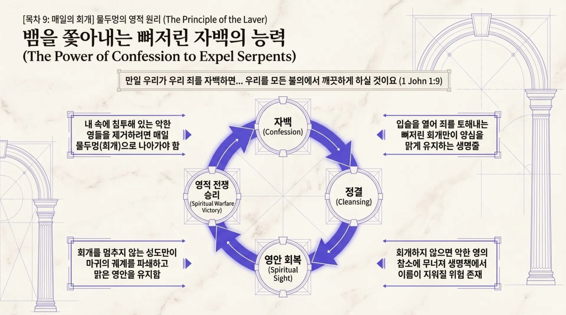 그러면 이미 내 속에 내려와 있는 영들과 내가 죄를 지어 불러들인 영들을 우리의 몸에서 제거하여 청소하려면 어떻게 해야 하는가? 우리가 이미 번제단에서 예수님의 피로 속죄(덮음)를 받았을지라도, 이미 내 속에 침투해 있는 영들은 하나도 나가지 않고 그대로 있다. 왜냐하면 속죄의 피는 죄를 덮어버리는 기능만 수행하기 때문이다. 그러므로 이미 내 속에 들어와 있는 악한 영들을 내쫓고 진정으로 깨끗해지려면, 매일매일 물두멍으로 나아가 자신의 죄를 자백하는 정결(회개)의 과정을 거쳐야만 한다. 입술을 열어 죄를 토해내는 이 뼈저린 회개만이 내 안의 더러운 뱀들을 쫓아내고 양심을 백지장처럼 맑게 유지할 수 있는 유일한 생명줄인 것이다. 고로 만약 우리가 회개로 자신의 육체 속에 들어있는 악한 영들을 제거하지 않으면 우리는 결코 지성소의 깊은 임재 안으로 들어갈 수 없을 것이다. 그리고 악한 영의 참소에 양심이 다시 무너져 결국 생명책에서 자신의 이름이 지워지는 비극을 맞이할 수도 있다.