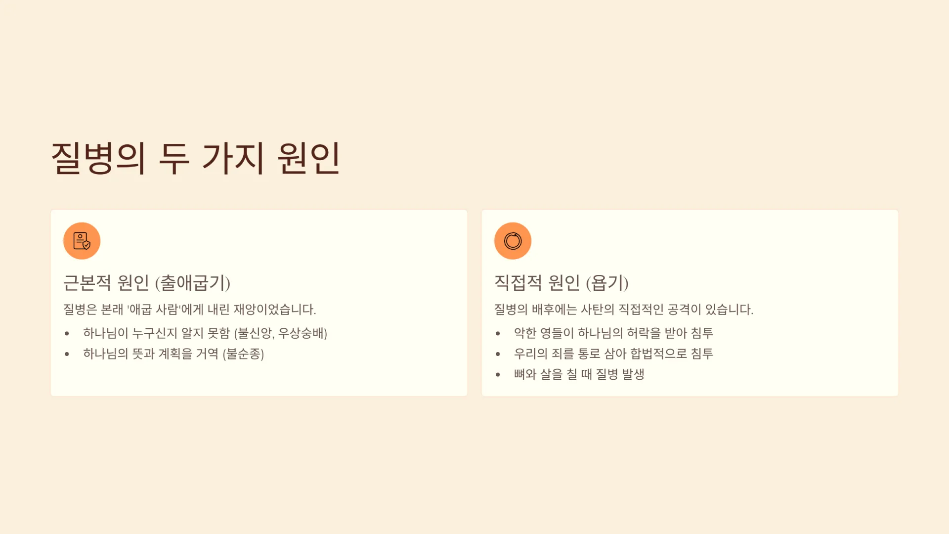 첫째, 근본적 원인(출애굽기)으로서, 질병은 본래 ‘애굽 사람’에게 내린 재앙이었다는 것이다. 이는 ① 하나님이 누구신지 알지 못하고(불신앙, 우상숭배), ② 하나님의 뜻과 계획을 거역(불순종)하기 때문에 발생하는 것이다. 둘째, 직접적 원인(욥기)으로서, 질병의 배후에는 사탄(악한 영, 귀신, 뱀)의 직접적인 공격이 있다는 것이다. 악한 영들이 하나님의 허락을 받아(욥의 경우) 혹은 우리의 죄를 통로 삼아(오늘날의 경우) 합법적으로 우리 몸에 침투하여 뼈와 살을 칠 때 질병이 발생하기 때문이다.