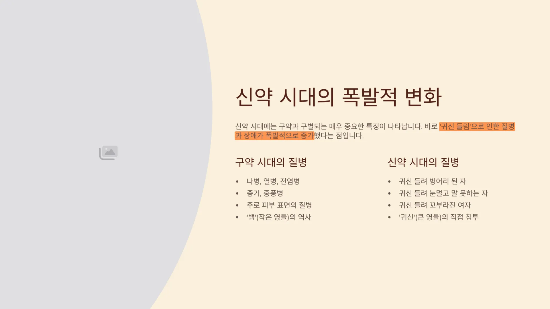 이처럼 신약 시대에 들어와서는 구약 시대에 주로 활동했던 ‘뱀’(작은 영들)뿐만 아니라, ‘귀신’(더 크고 강력한 영들)이 사람의 몸속에 직접 침투하여 질병과 장애를 일으키는 사례가 훨씬 더 많아졌다. 이는 아마도 예수님의 성육신과 공생애 시작을 기점으로, 하늘에서 큰 영적 전쟁이 있었고(계 12:7-9 참조), 수많은 타락한 천사(귀신)들이 이 땅으로 쫓겨 내려와 사람들의 몸을 처소로 삼기 시작했기 때문으로 추정된다.