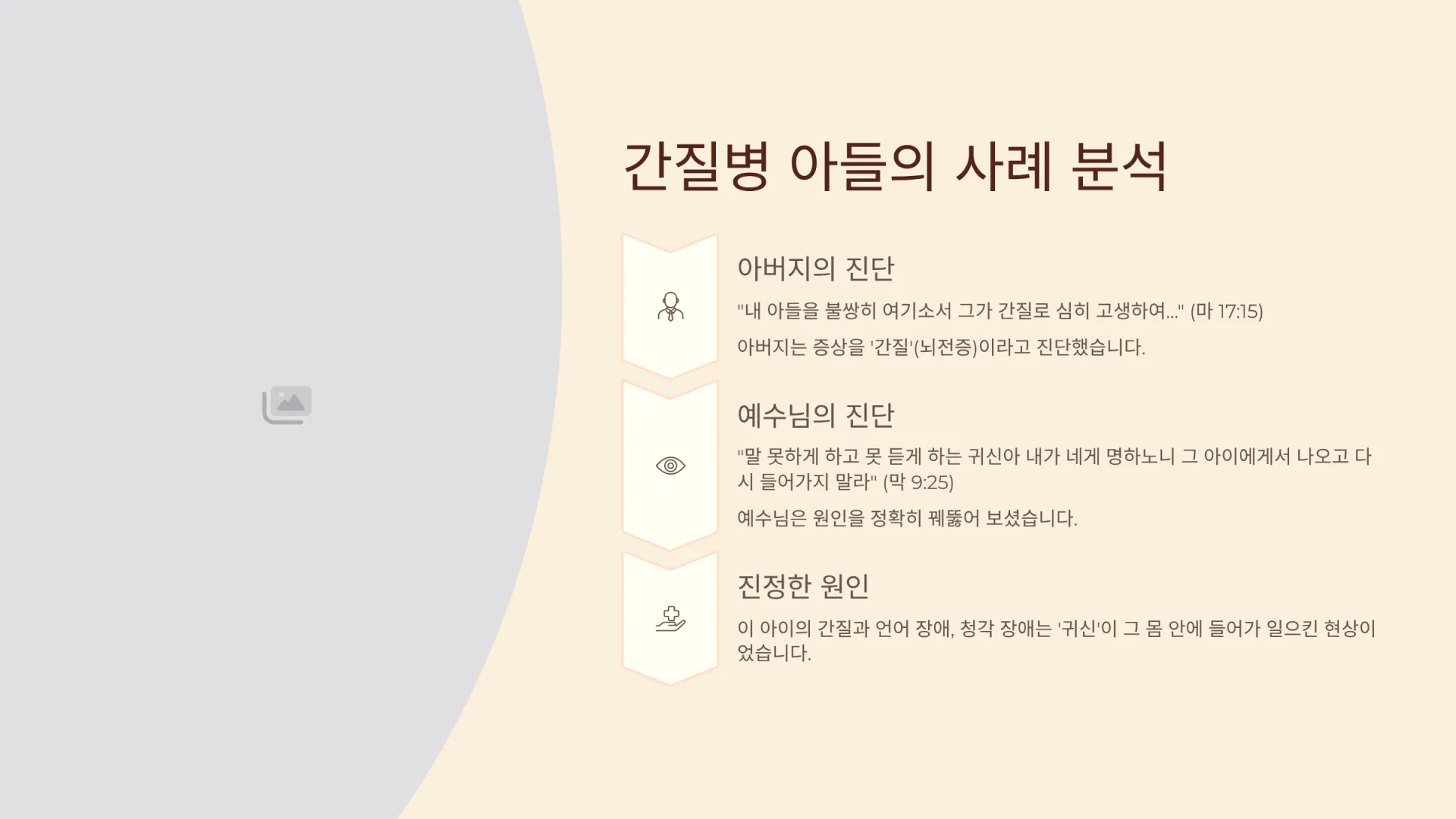 이것을 좀 더 살펴보면 이렇다. 어느날 간질병에 걸린 아들을 둔 아버지가 찾아왔다. 그리고 부탁했다. “내 아들을 불쌍히 여기소서 그가 간질로 심히 고생하여…”(마 17:15) 아버지는 아들의 증상을 '간질'(뇌전증)이라고 진단했지만, 예수님께서는 그 원인을 정확히 꿰뚫어 보셨다. 왜냐하면 그 속에 귀신이 들어있었기 때문이다. 그러므로 평행본문인 마가복음 9장 25절을 보면, 예수께서는 그 아이 속에 있는 영을 향해 “말 못하[게 하]고 못 듣[게 하]는 귀신아 내가 네게 명하노니 그 아이에게서 나오고 다시 들어가지 말라”고 꾸짖으셨다. 즉, 이 아이의 간질과 언어 장애, 청각 장애는 ‘귀신’이 그 몸 안에 들어가 일으킨 현상이었던 것이다.