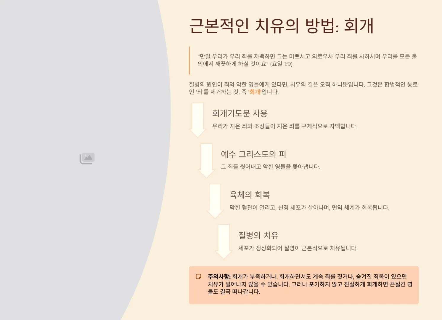 물론 회개를 한다고 해서 모든 병이 다 치유된다거나 즉각 치유된다고 말할 수는 없다. 그러나 회개가 부족하거나(천 번, 이천 번 이상 필요할 수 있음), 회개하면서도 계속 죄를 짓고 있거나(귀신에게 밥을 줌), 아직 회개하지 않은 숨겨진 죄목이 있으면 치유가 일어나지 않기도 하기 때문이다. 그러나 포기하지 않고 진실하게 회개하면, 끈질긴 영들도 결국 떠나가게 되어 있다.