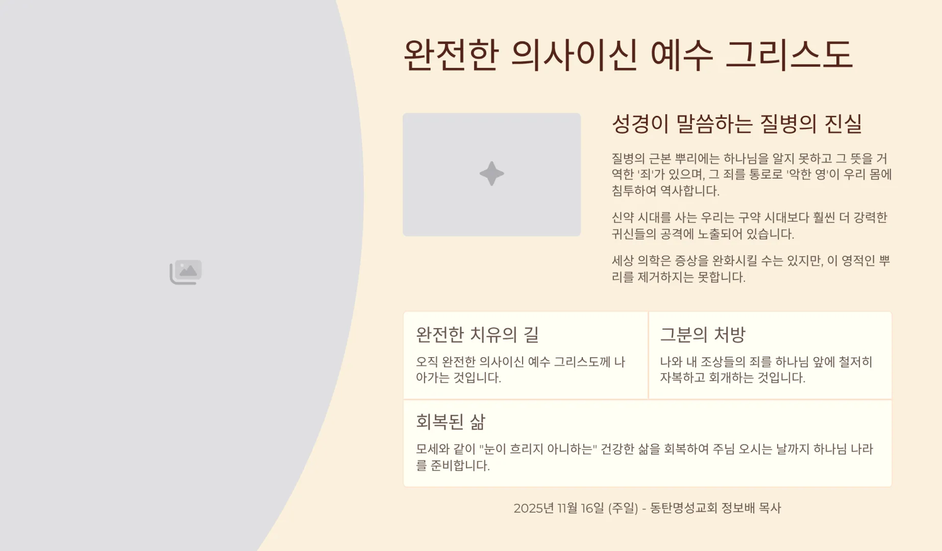 해당 설교는 성경에 나타난 질병들을 영적인 관점에서 해석하며, 질병의 발생이 단순히 신체적인 문제가 아니라 악한 영과 깊이 연관되어 있다고 강조합니다. 그는 성경 속 질병들의 종류가 현대만큼 다양하게 분류되지 않았으며, 창세기에서 처음 등장하는 질병은 종기(욥기)이고 구약 성경의 질병은 주로 하나님의 뜻에 불순종한 결과로 오는 재앙으로 나타난다고 설명합니다. 특히 신약 시대로 넘어오면서 '귀신 들려'라는 표현과 함께 귀신이 질병의 실체로 자주 언급되며, 이는 중풍병, 열병, 심지어 신체적 장애까지도 악한 영의 작용일 수 있음을 시사합니다. 따라서 강연자는 질병으로부터 벗어나기 위해서는 철저한 회개를 통해 몸속에 자리 잡은 뱀과 귀신 같은 악한 영들을 내보내는 영적 싸움이 필수적이며, 이를 통해 육체를 '의의 병기'로 바쳐 천국을 준비해야 한다고 역설합니다.