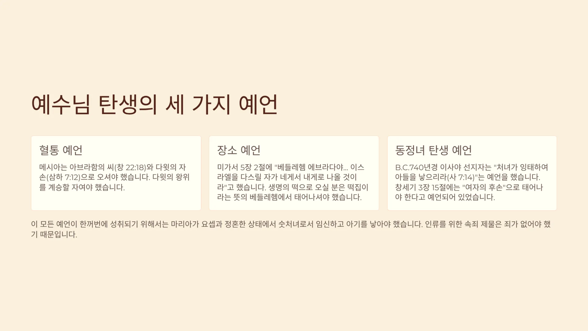첫째, 혈통에 관한 예언이 있다. 메시아는 아브라함의 씨(창 22:18)와 다윗의 자손(삼하 7:12)으로 오셔야 했기 때문이다. 특히 태어날 메시야는 다윗의 왕위를 계승할 자여야 했다. 둘째, 장소에 관한 예언이 있다. 미가서 5장 2절에 "베들레헴 에브라다야... 이스라엘을 다스릴 자가 네게서 내게로 나올 것이라"고 했다. 반드시 예수께서는 생명의 떡으로 이 세상에 들어오실 뿐이었기에 떡집이라는 뜻을 가진 베들레헴에서 태어나셔야 했던 것이다. 그리고 그도 다윗왕을 이을 자이므로 다윗왕의 고향인 베들레헴에서 태어나셔야 했던 것이다. 셋째, 동정녀 탄생에 관한 예언이 있다. B.C.740년경 이사야 선지자는 "처녀가 잉태하여 아들을 낳으리라(사 7:14)"는 예언을 했다. 그리고 태어날 메시야는 창세기 3장 15절이 보면, "여자의 후손"으로 태어나야 한다고 예언되어 있었다. 그래서 이 모든 말씀들이 한꺼번에 성취되기 위해서는 당시 마리아가 요셉과 정혼한 상태에서 마리아가 아기를 출산해야 한다. 그리고 마리가가 숫처녀로서 임신을 하고 아기를 낳아야 하는 이유는 인류를 위한 속죄 제물은 죄가 없어야 했기 때문이다. 이는 남자의 씨가 아닌 성령으로 잉태되는 방법밖에 없었다. 그래서 동정녀 마리아에게 성령으로 잉태되신 분이 예수님이셨던 것이다.