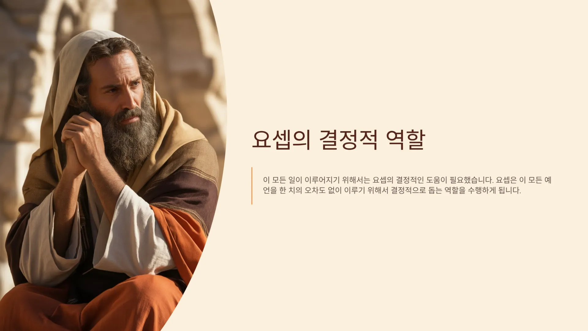 이 설교는 마리아의 약혼자였던 요셉의 사명이 무엇이었는지를 성경적 예언에 근거하여 탐구합니다. 목사는 먼저, 모든 인간에게는 사명이 있음을 강조하며, 요셉의 가장 핵심적인 사명이 바로 아기 예수와 마리아를 보호하는 것이었다고 설명합니다. 특히 메시아 탄생에 관한 구약의 예언들을 네 가지 핵심 주제로 나누어 제시하는데, 첫째는 혈통에 관한 예언으로 예수가 아브라함과 다윗의 자손으로 태어나야 했기에, 요셉이 파혼하지 않고 마리아를 아내로 맞이하는 것이 필수적이었다는 점을 강조합니다. 둘째, 메시아가 베들레헴에서 탄생해야 한다는 장소에 관한 예언을 이루기 위해 하나님께서 로마 황제의 호적령까지 움직이셨으며, 셋째, 예수가 흠 없는 속죄 제물이 되기 위해 성령으로 잉태되어 죄가 없는 상태로 태어나야 했고, 요셉은 아기를 낳기까지 마리아와 동침하지 않음으로써 이를 보호했다고 설명합니다. 결국 요셉의 역할은 이 모든 예언이 성취되어 예수 그리스도가 진정한 메시아로 이 땅에 오실 수 있도록 돕는 것이었습니다.