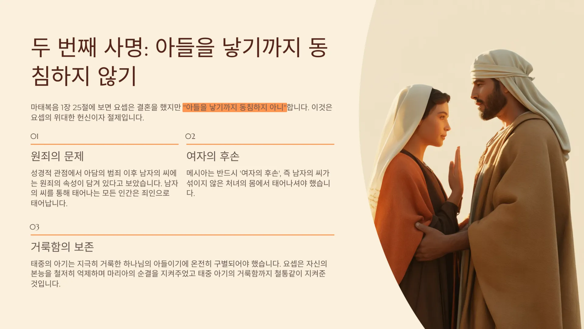 마태복음 1장 25절에 보면 요셉은 결혼을 했지만 "아들을 낳기까지 동침하지 아니"한다. 왜 그랬을까? 이것은 요셉의 위대한 헌신이자 절제다. 왜 동침하면 안 되었을까? 여기에는 중요한 영적 비밀이 있다. 성경적 관점에서 아담의 범죄 이후 남자의 씨에는 원죄의 속성이 담겨 있다고 보았다. 남자의 씨를 통해 태어나는 모든 인간은 죄인으로 태어난다는 것이다. 그런데 메시아는 반드시 '여자의 후손', 즉 남자의 씨가 섞이지 않은 처녀의 몸에서 태어나셔야 했다. 그러므로 아기가 마리아의 뱃속에 있는 한 요셉은 조심해야 했다.