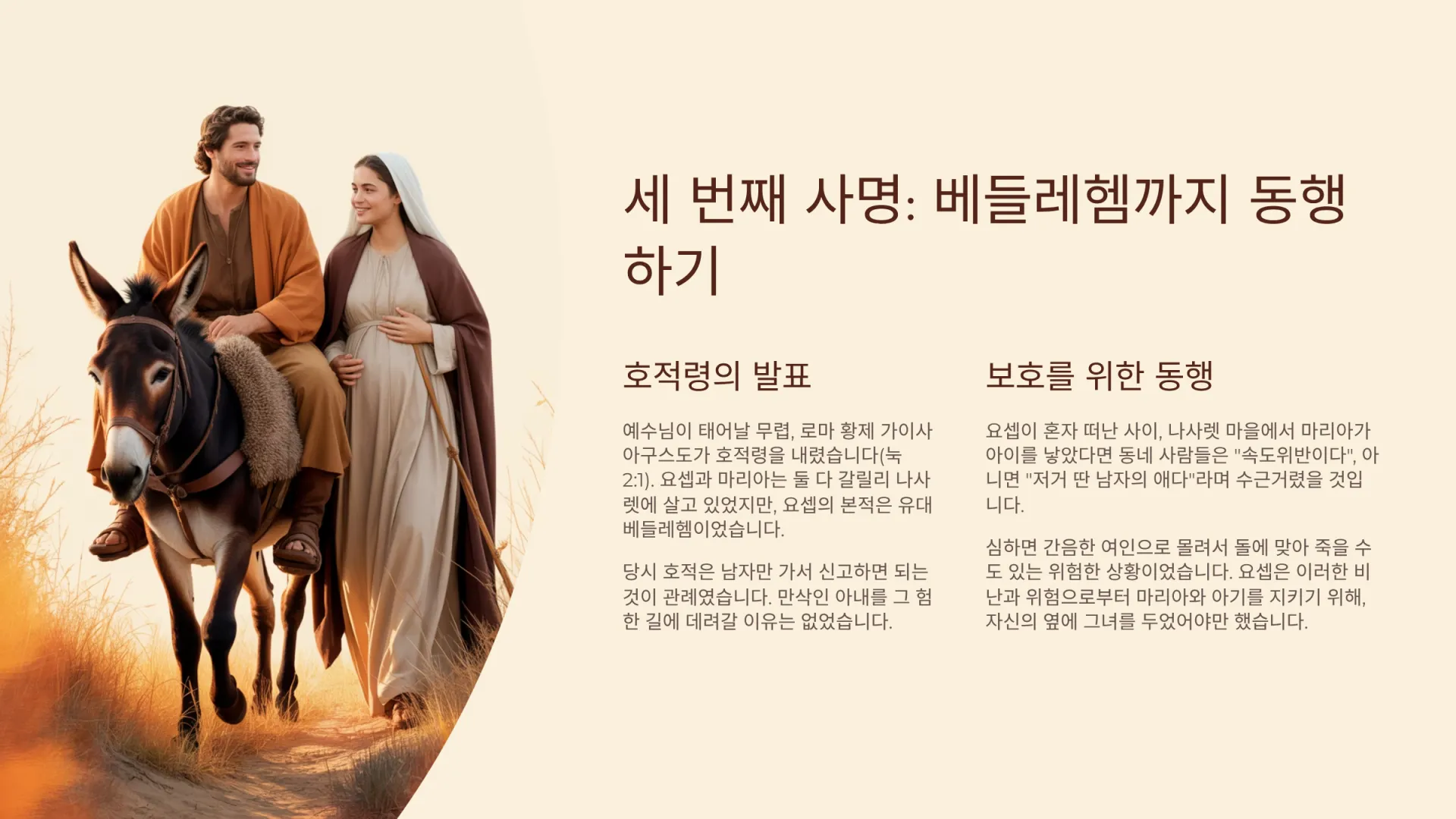 예수님이 태어날 무렵, 로마 황제 가이사 아구스도가 호적령을 내렸다(눅 2:1). 요셉과 마리아는 둘 다 갈릴리 나사렛에 살고 있었지만, 요셉의 본적은 유대 베들레헴이었다. 그래서 호적을 하러 가야 했다. 당시 호적은 남자만 가서 신고하면 되는 것이 관례였다. 만삭인 아내를 그 험한 길에 데려갈 이유는 없었다. 그런데 왜 요셉은 굳이 무거운 몸의 마리아를 데리고 갔을까? 이는 그녀를 '보호'하기 위해서다.
