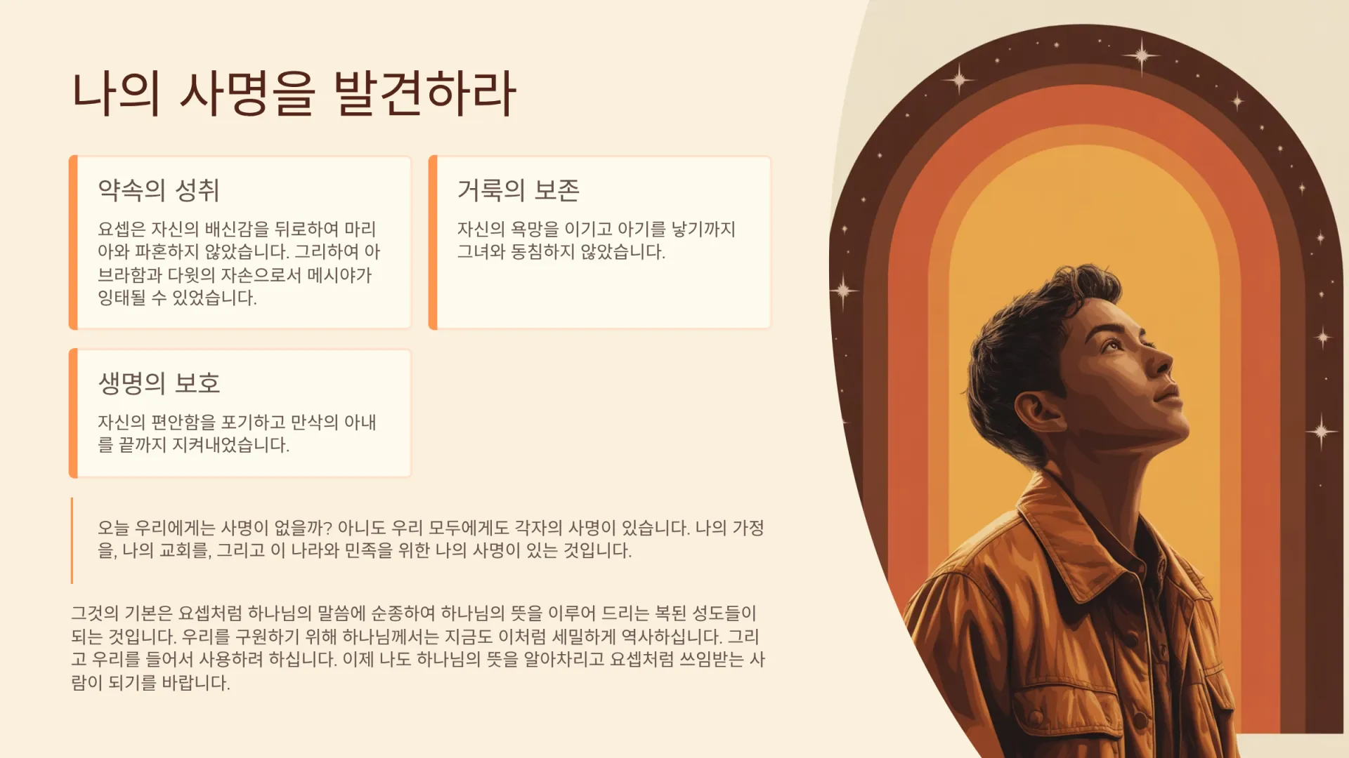 그러므로 이 진품 메시아가 태어나도록 하기 위해 하나님께서는 요셉이라는 한 청년을 불러내셨다. 마리아와 약혼한 상태에 있었던 당시의 요셉은 자신의 약혼녀가 임신했다는 소식을 들었지만 자신의 배신감을 뒤로하여 그녀와 파혼하지 않았다. 그리하여 아브라함과 다윗의 자손으로서 메시야가 잉태될 수 있었다(약속의 성취). 그리고 자신의 욕망을 이기고 아기를 낳기까지 그녀와 동침하지 않았으며(거룩의 보존), 자신의 편안함을 포기하고 만삭의 아내를 끝까지 지켜내었다(생명의 보호). 그런데 오늘 우리에게는 사명이 없을까? 아니도 우리 모두에게도 각자의 사명이 있다. 나의 가정을, 나의 교회를, 그리고 이 나라와 민족을 위한 나의 사명이 있는 것이다. 그리고 그것의 기본 요셉처럼 하나님의 말씀에 순종하여 하나님의 뜻을 이루어 드리는 복된 성도들이 되는 것이다. 우리를 구원하기 위해 하나님께서는 지금도 이처럼 세밀하게 역사하신다. 그리고 우리를 들어서 사용하려 하신다. 이제 나도 하나님의 뜻을 알아차리고 요셉처럼 쓰임받는 사람이 되기를 바란다.