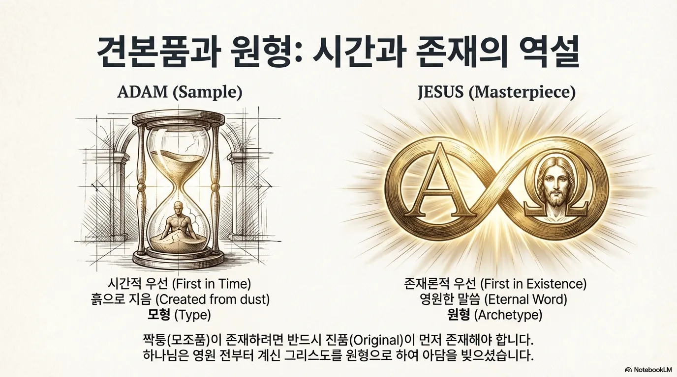 고로 시간적으로 볼 때 아담이 최초로 창조된 것이지만, 존재론적으로 보면 예수님이 먼저 계셨다는 것이다. 왜냐하면 원형(Archetype)이 있어야 모형(example, model)이 나오기 때문이다. 고로 하나님께서는 영원 전부터 계신 예수 그리스도(하나님의 형상)를 원형으로 하여, 흙으로 아담을 빚어낸 것이다.