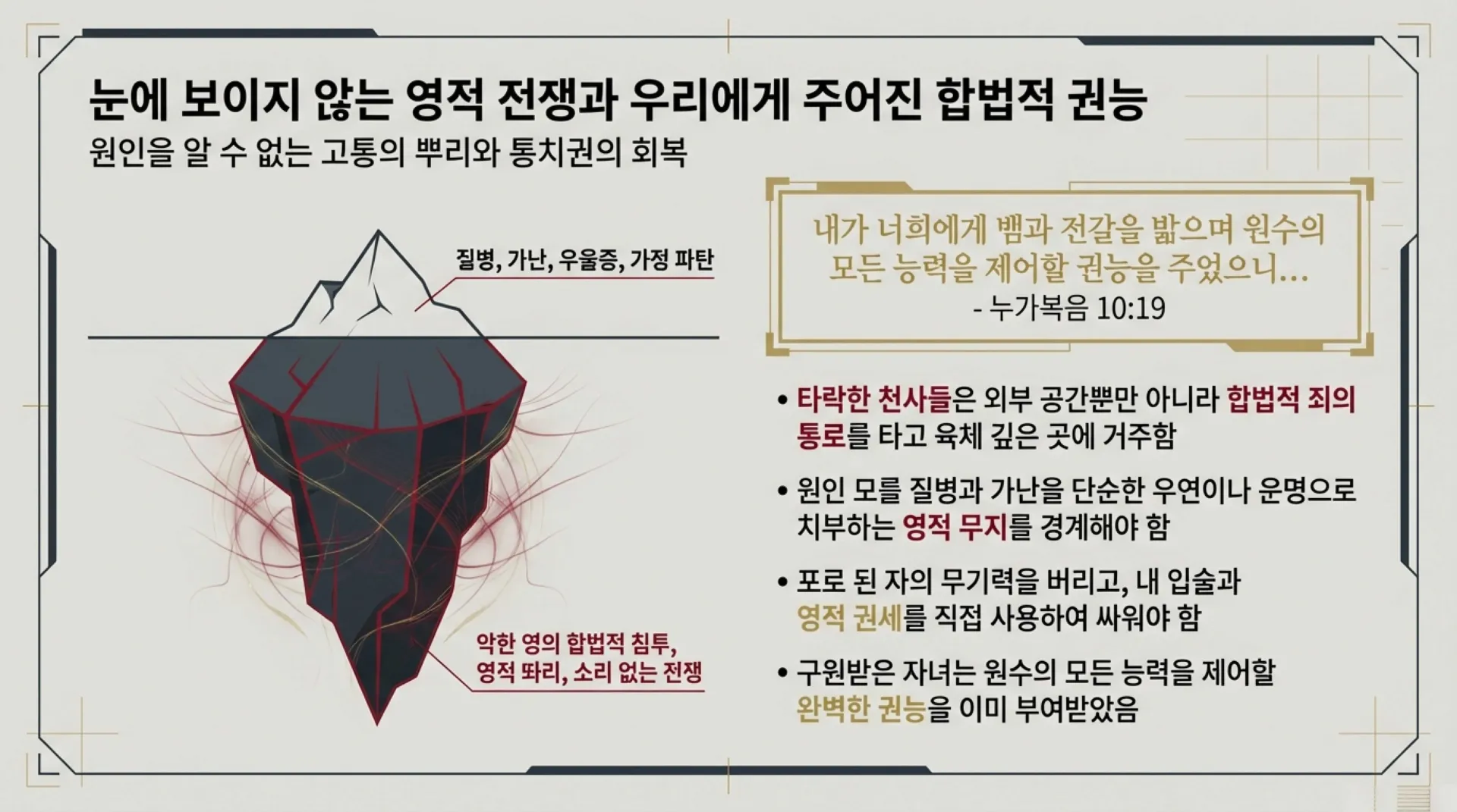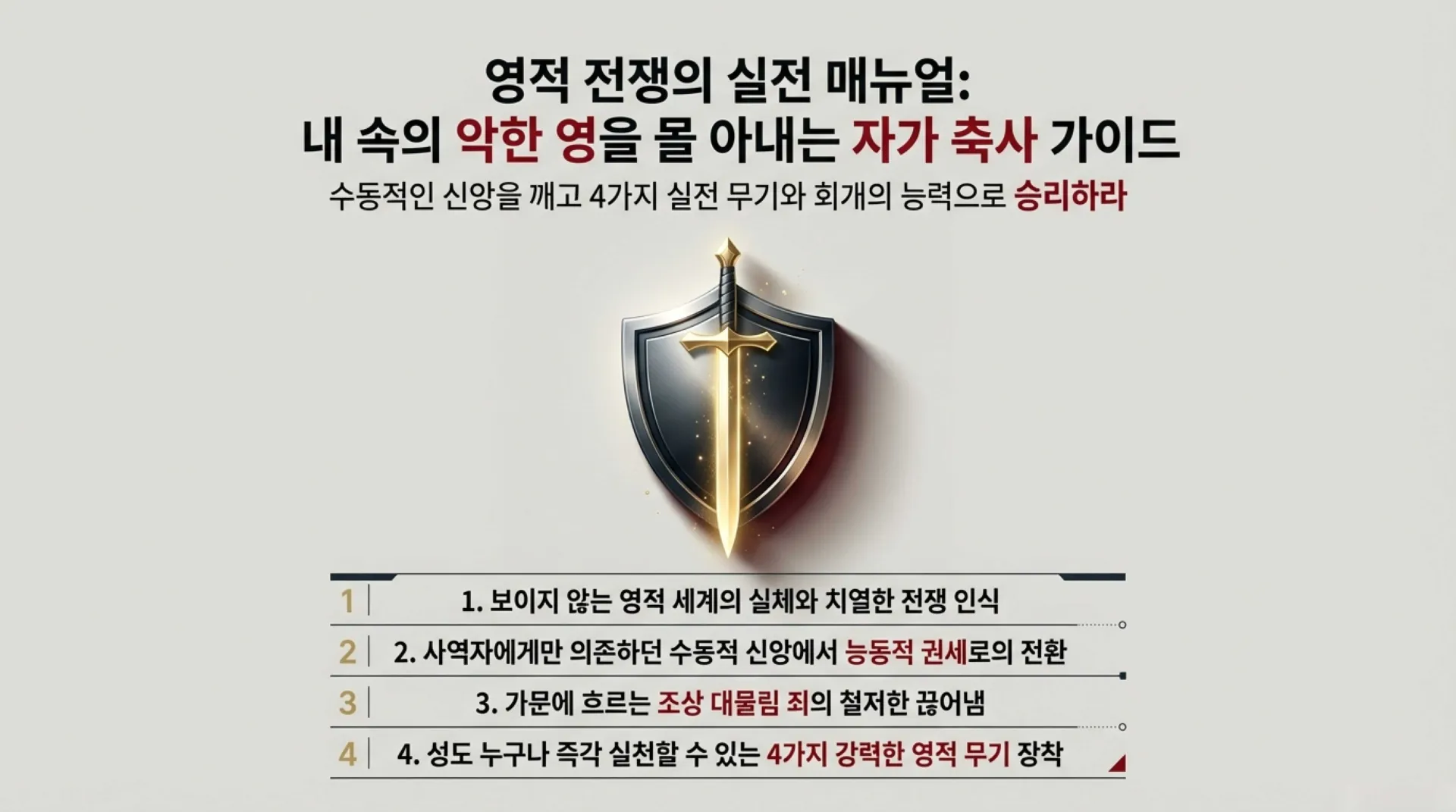 많은 그리스도인이 내 속에 침투한 악한 영의 존재를 무지한 채, 원인 모를 질병과 가난, 우울증과 가정 파탄의 고통을 단순한 우연이나 운명으로 치부하며 살아간다. 혹은 영적 눌림을 깨닫는다 해도, 매번 능력 있는 사역자를 찾아가 안수를 구걸하는 수동적인 신앙에 머무는 경우가 허다하다. 그러나 하나님은 우리를 무기력한 포로로 부르지 않으셨다. 주님은 구원받은 하나님의 자녀들에게 뱀과 전갈을 밟으며 원수의 모든 능력을 제어할 권능을 이미 주셨던 것이다(눅 10:19). 그러므로 이제 우리는 사역자에게만 의존하던 낡은 틀을 깨고, 내 입술과 영적 권세를 사용하여 내 몸과 가정에 침투한 악한 영들을 스스로 몰아내는 '자가 축사(Self-Exorcism)'의 강력한 무기를 장착해야 한다.