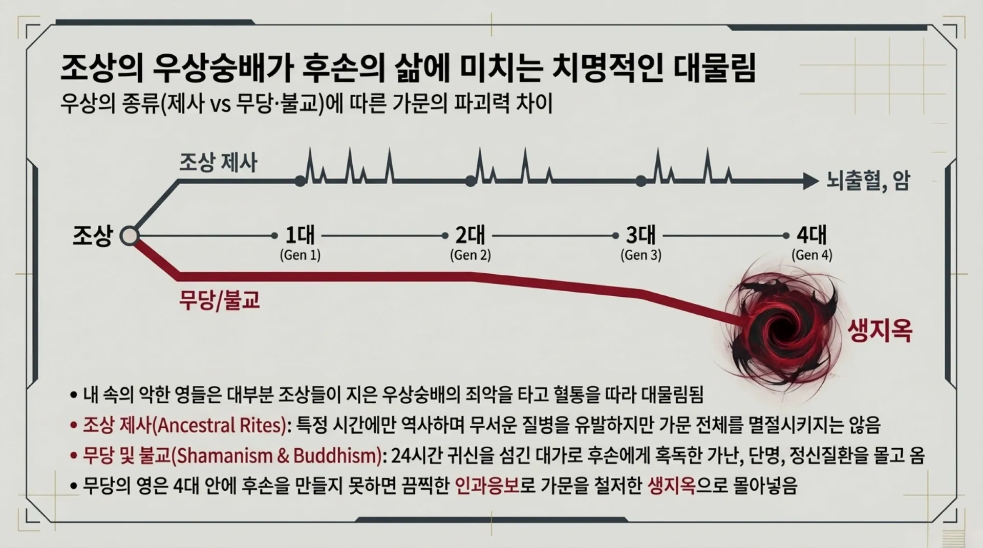2. 조상들이 섬긴 우상숭배(제사, 부처 불교, 무당 점쟁이, 미신 잡신)의 죄는 왜 후손들에게 각기 다른 무게와 증상으로 대물림되는가?