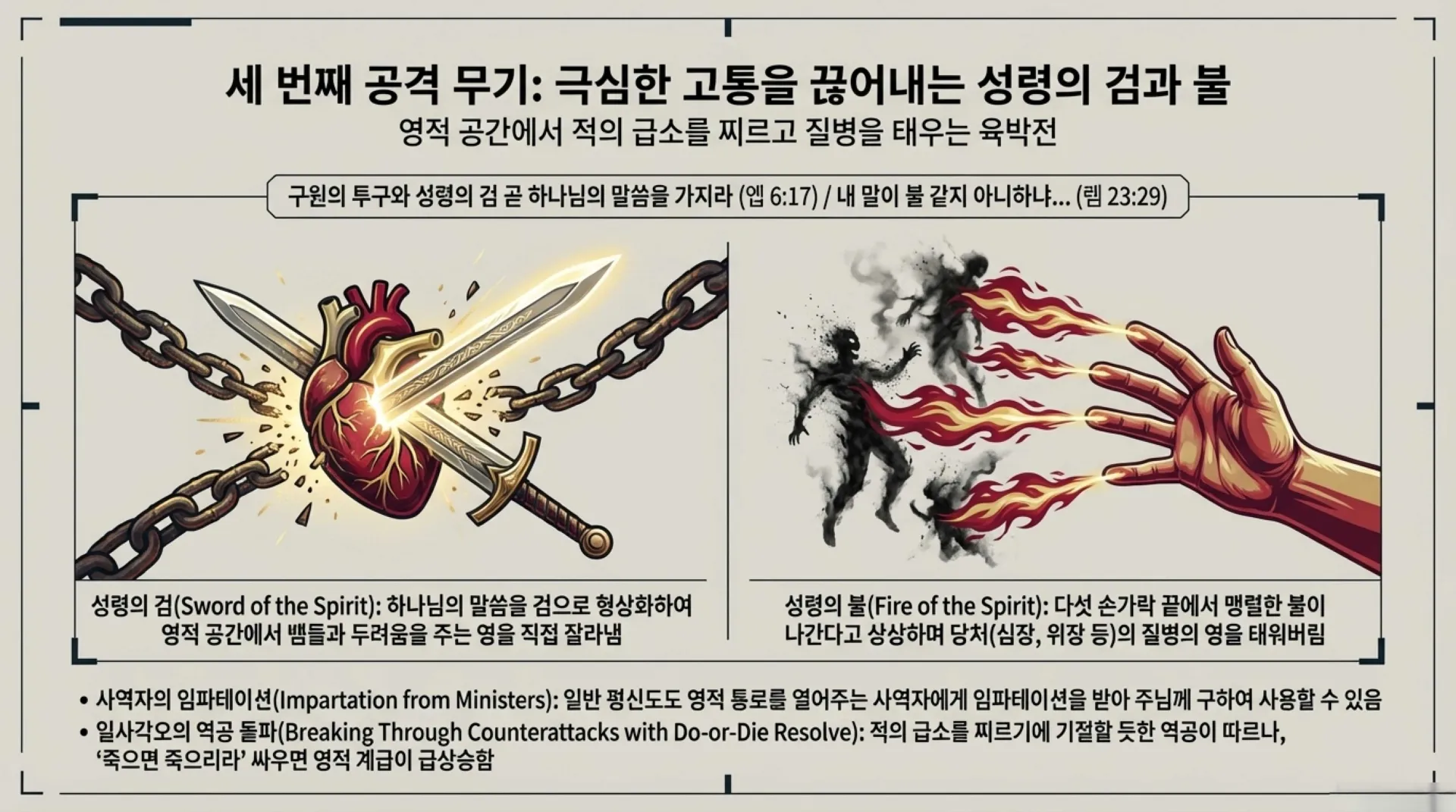 6. 영적 전쟁의 최전선에 서는 사역자나 강한 믿음을 가진 자가 죽기 살기로 사용해야 할 강력한 무기(칼과 불)는 어떻게 활용해야 하는가?