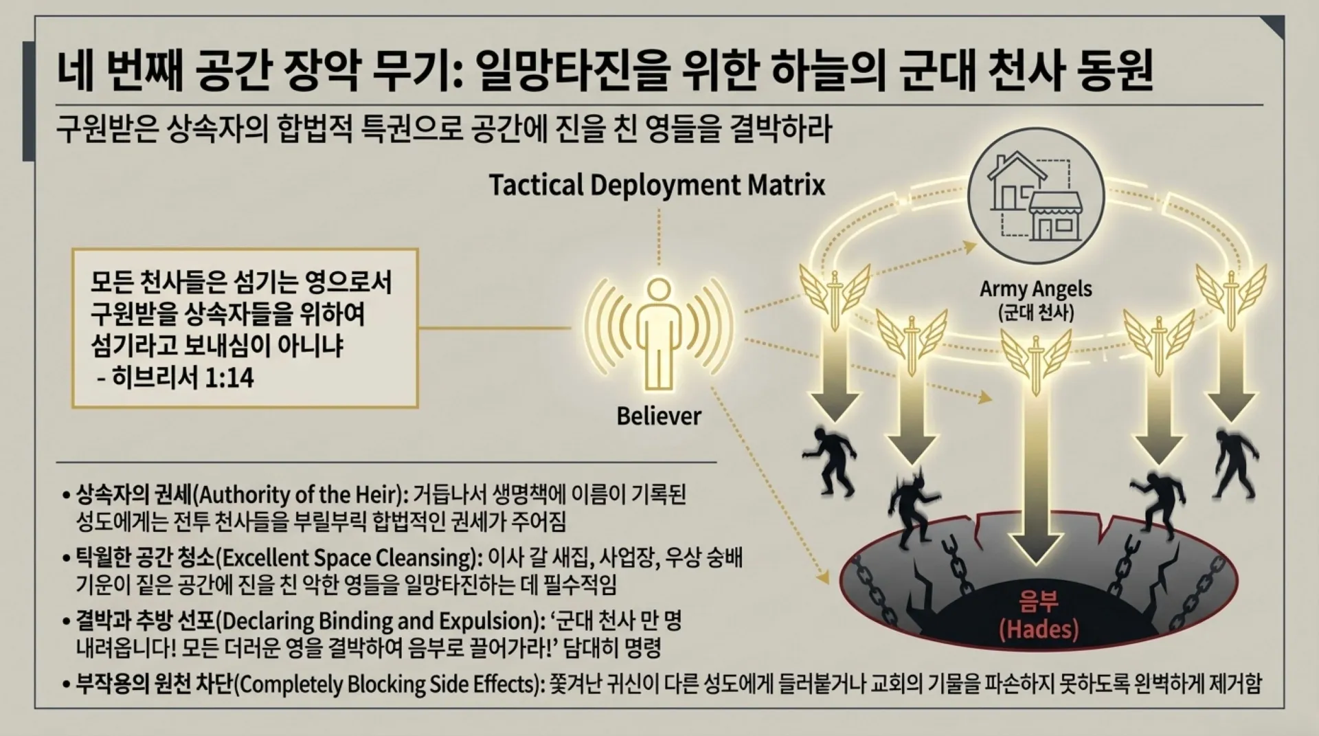 그렇다면 자가 축사법의 대미를 장식하는 가장 장엄한 무기는 무엇인가? 그것은 네번째로 '하늘의 군대 천사'를 동원하는 것이다. 이 방법은 우리 몸속의 영들뿐만 아니라, 우리 주변에 있는 영들 곧 이사 갈 새집, 사업장, 혹은 우상 숭배의 기운이 짙은 공간(모텔 등)에 진을 치고 있는 악한 영들을 일망타진하는 데 아주 탁월한 위력을 발휘한다. 왜냐하면 하늘에 있는 천사들 중에는 이미 거듭나서 하늘나라의 상속자가 될 사람들을 섬기기 위해 준비된 천사들이 있기 때문이다. 이들을 가리켜 우리는 '군대천사들(전투천사들)'이라고 부른다.