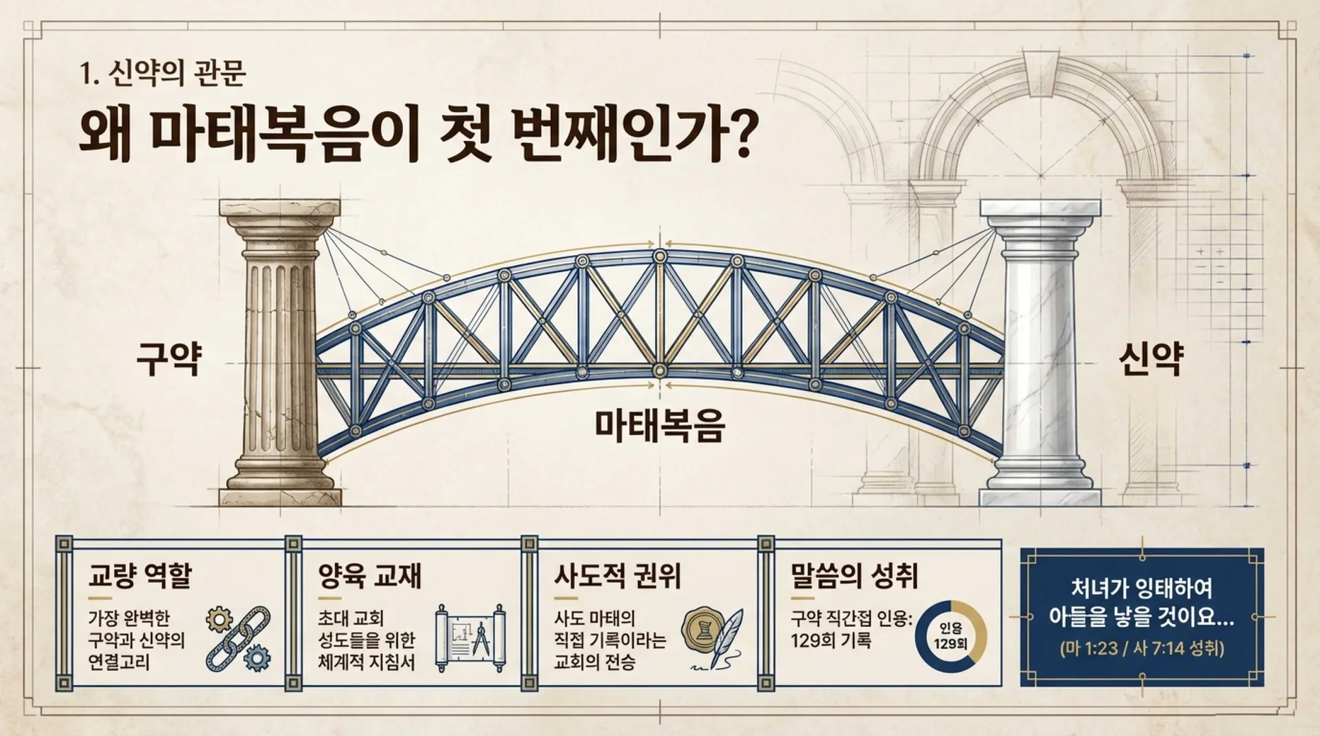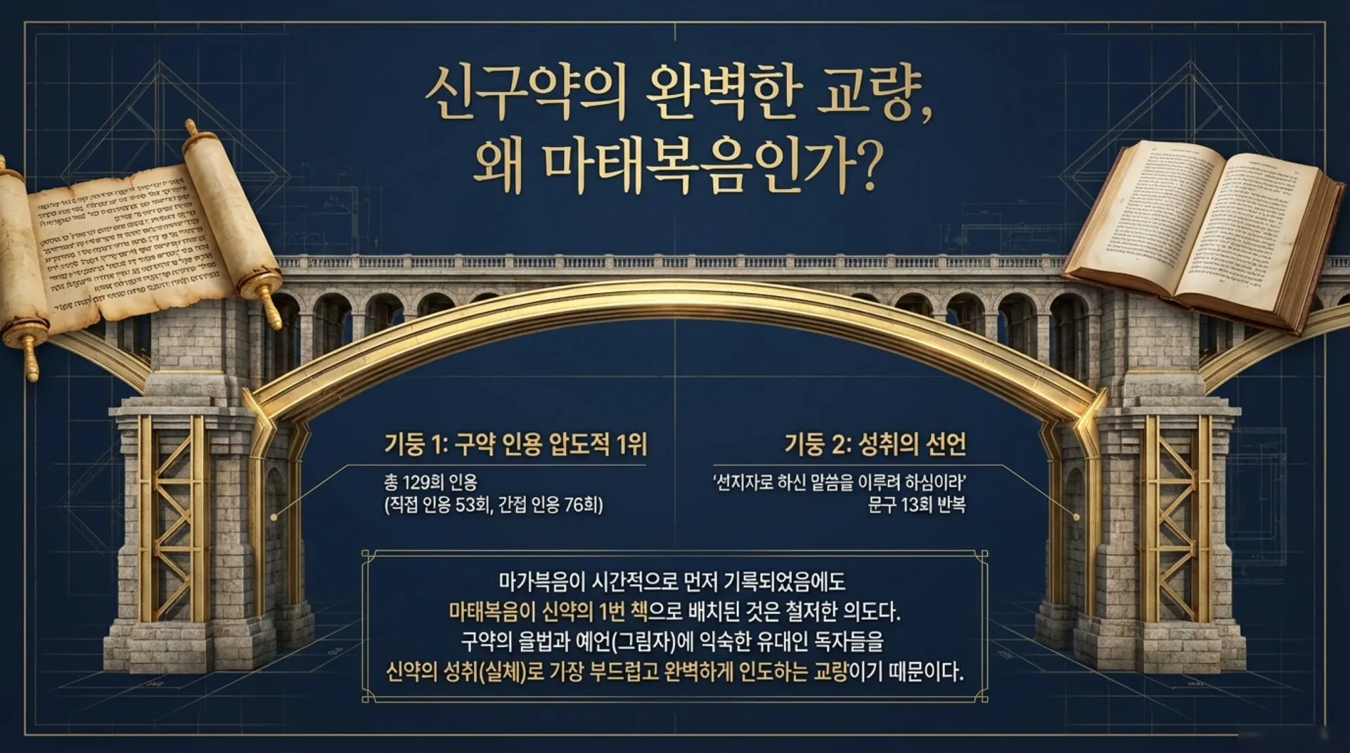 첫째, 마태복음이야말로 구약 성경과 신약 성경을 이어주는 가장 완벽한 교량(Bridge) 역할을 하기 때문이다. 마태는 구약 성경을 무려 129회나 직간접적으로 인용하며, 선지자로 하신 말씀을 이루려 하심이라는 공식을 반복해서 사용한다. 처녀가 잉태하여 아들을 낳을 것이라는 이사야의 예언(사 7:14)부터, 베들레헴에서 왕이 나실 것이라는 미가의 예언(미 5:2)까지, 예수님의 생애 모든 순간이 구약 예언의 성취임을 치밀하게 입증한다. 이처럼 구약의 그림자가 신약의 실체인 예수님에게서 어떻게 성취되었는지를 가장 명확하게 설명해 주기 때문에, 마태복음은 신약 성경의 문을 여는 제1권으로 채택된 것이라고 보여진다.