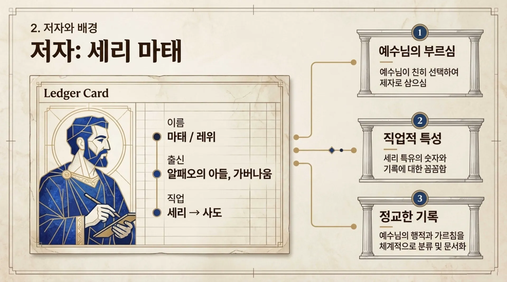 이 책의 저자는 누구인가? 이 책, 곧 마태복음의 저자는 '마태'이다. 이 책의 저자가 마태였다는 데에서, 초기 교회사의 인물들 가운데 이의를 제기한 사람은 없었다. 그렇다면 마태는 누구인가? 그는 알패오의 아들로서 가버나움의 세리였다. 그의 이름은 '레위'라고도 불렸다. 그런데 그를 예수께서 친히 선택하여 제자로 삼았다. 그리고 복음을 전파하도록 파송했다. 그러므로 마태는 12사도들 가운데 한 사람인 것을 알 수 있다.