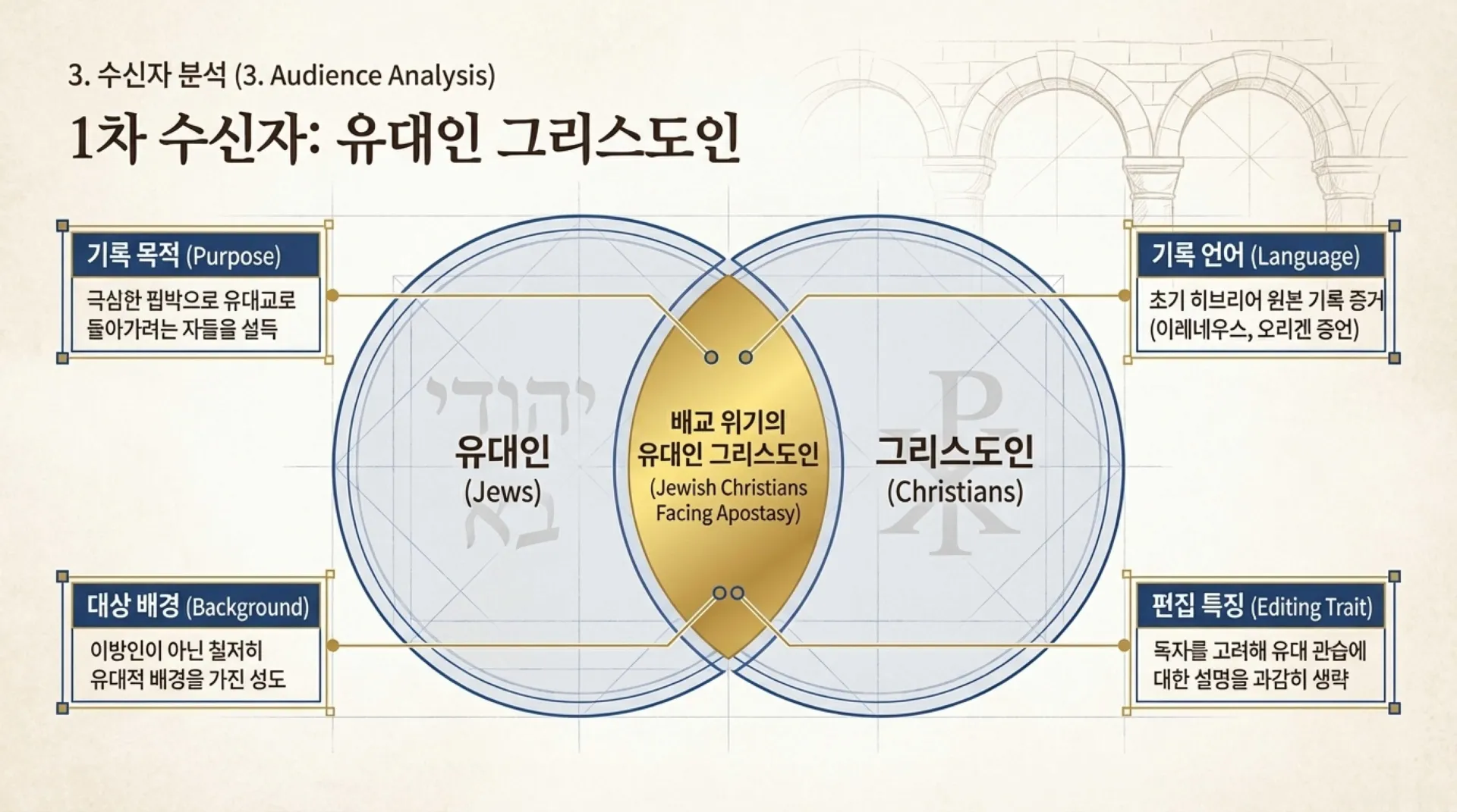 그렇다면 마태는 대체 누구를 위해 이 책을 써야만 했던 것인가? 그것은 한 마디로 유대인이지만 이제 기독교인이 된 자들을 위해 쓴 것이다. 이 책의 1차적 수신자는 유대인 그리스도인들이다. 왜냐하면 이들이 다시 유대교로 돌아가려고 했기 때문이다. 그래서 그렇게 하지 않도록, 예수께서 바로 율법과 선지자가 말씀했던 바로 그 메시야이심을 알리기 위해 이 책을 쓴 것이다. 그러므로 이 책의 수신자는 이방인들이 아니다. 이 책의 수신자는 유대 그리스도인들인 것이다. 그렇다면 이 책의 수신자들이 이제 유대교에서 기독교로 개종한 자들이었다는 사실을 우리는 어떻게 알 수 있는가? 그것은 다음과 같은 3가지 증거가 있다.