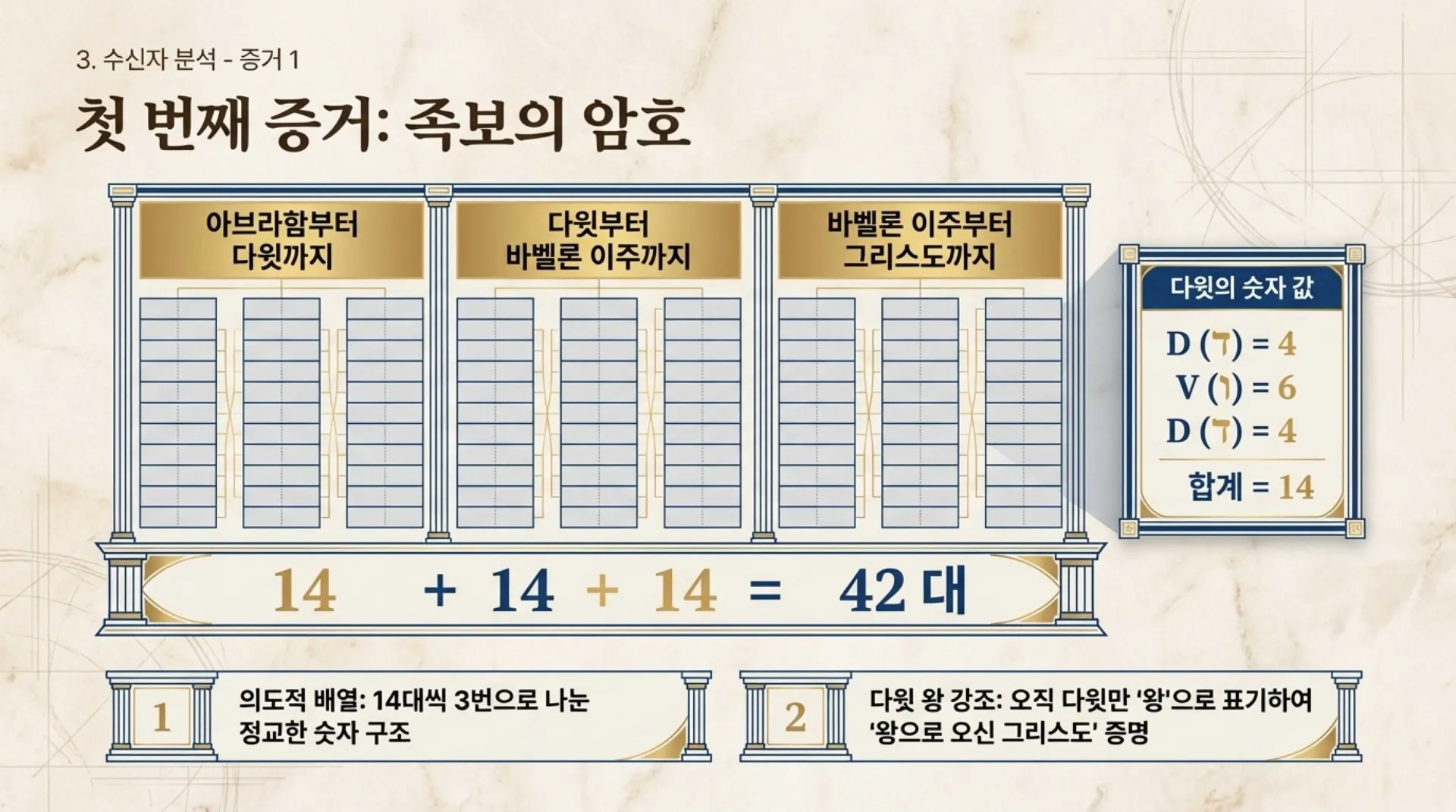 이것을 직역하면 이렇다. "아브람의 자손이신, 다윗의 자손이신, 그리스도이신 예수의 기원의 책[이다]." 그리고 1장 2절부터 17절까지 예수님의 족보를 기록하고 있다. 그러므로 우리는 이 책의 독자가 아브라함과 다윗을 매우 중요하게 여기는 자들이라는 것을 알 수 있다. 그리고 아브라함부터 예수님까지 족보의 인물들을 구분하고 있는데, 14대를 3번 언급한다. 즉 아브라함부터 다윗까지가 14대요, 다윗부터 바벨론의 이주까지가 14대요, 바베론의 이주부터 그리스도까지 14대라고 말씀한다(마1:17). 그러니까 예수님은 아브라함의 42대손(14+14+14)으로 오신 것이요, 다윗의 28대손(14+14)으로 오신 것이다. 그렇다면 이 책의 저자는 왜 아브라함부터 예수님 대까지이 족보를 14대로 나누었는가? 그 기준은 무엇인가? 그것은 이 책의 주제가 '왕으로 오신 그리스도'인 것을 강조하고자 함이다. 그래서 42대 족보의 인물 가운데 오직 다윗만을 '다윗 왕'이라고 소개하고 있는 것이다(마1:6). 그리고 다윗을 히브리어 알파벳으로 쓰고 그것을 숫자값으로 환산하면 14가 되기 때문이다.