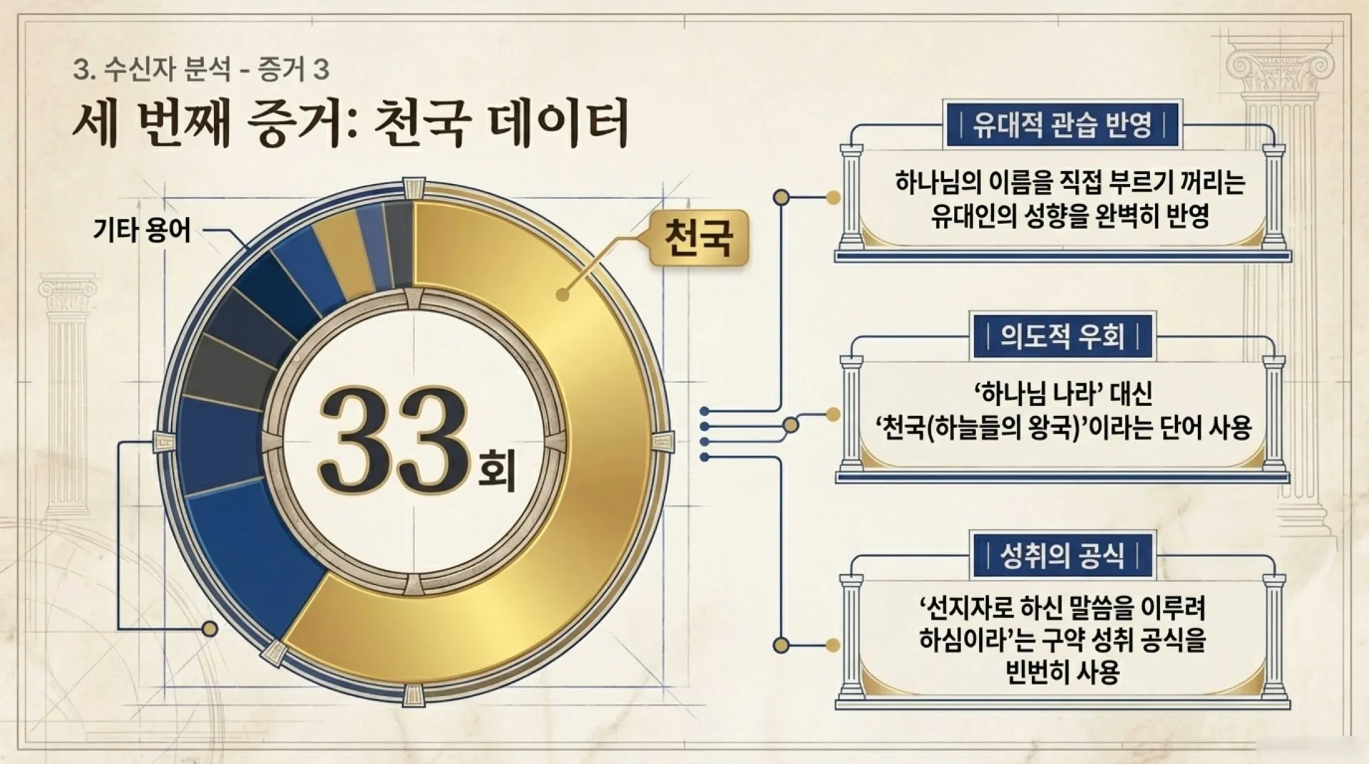 더욱 놀라운 특징은 다른 복음서 저자들이 하나님 나라(Kingdom of God)라는 용어를 사용할 때, 마태는 유독 '천국(하늘들의 왕국, Kingdom of Heaven)'이라는 독특한 단어를 무려 33번이나 반복해서 사용했다는 점이다. 유대인들이 하나님의 이름을 직접 부르기를 꺼려하여 하늘이라는 단어로 우회해서 표현했다는 신학적 견해도 있기는 하지만, 더 본질적인 이유는 마태가 강조하고자 했던 천국의 성격에 있다.