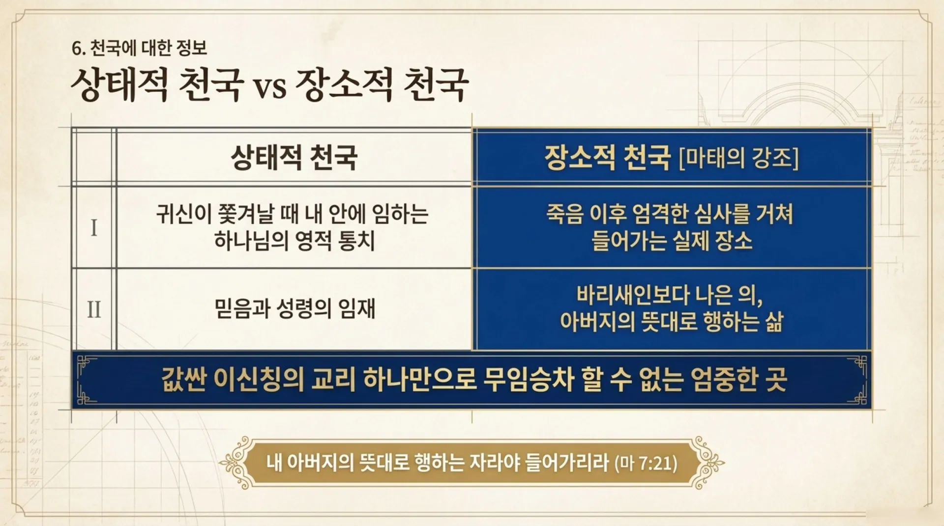 하나님 나라가 성령을 힘입어 내 안의 귀신이 쫓겨날 때 임하는 하나님의 왕적 통치, 즉 상태적 천국을 주로 의미한다면(마 12:28), 마태가 고집한 천국(하늘들의 왕국)은 우리가 죽은 뒤에 반드시 심사를 거쳐 들어가야만 하는 실제적이고도 장소적인 천국을 강력하게 시사한다.
