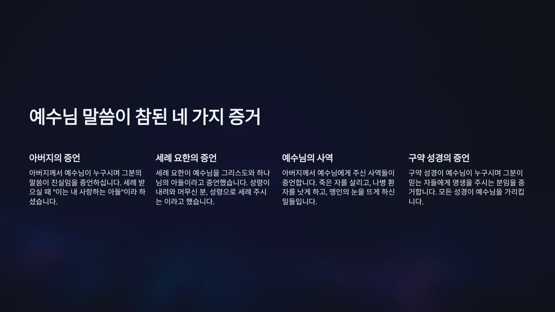 4. 예수님의 증언 곧 예수께서 하신 말씀이 참이요 진리라는 4가지 증거는 무엇인가?