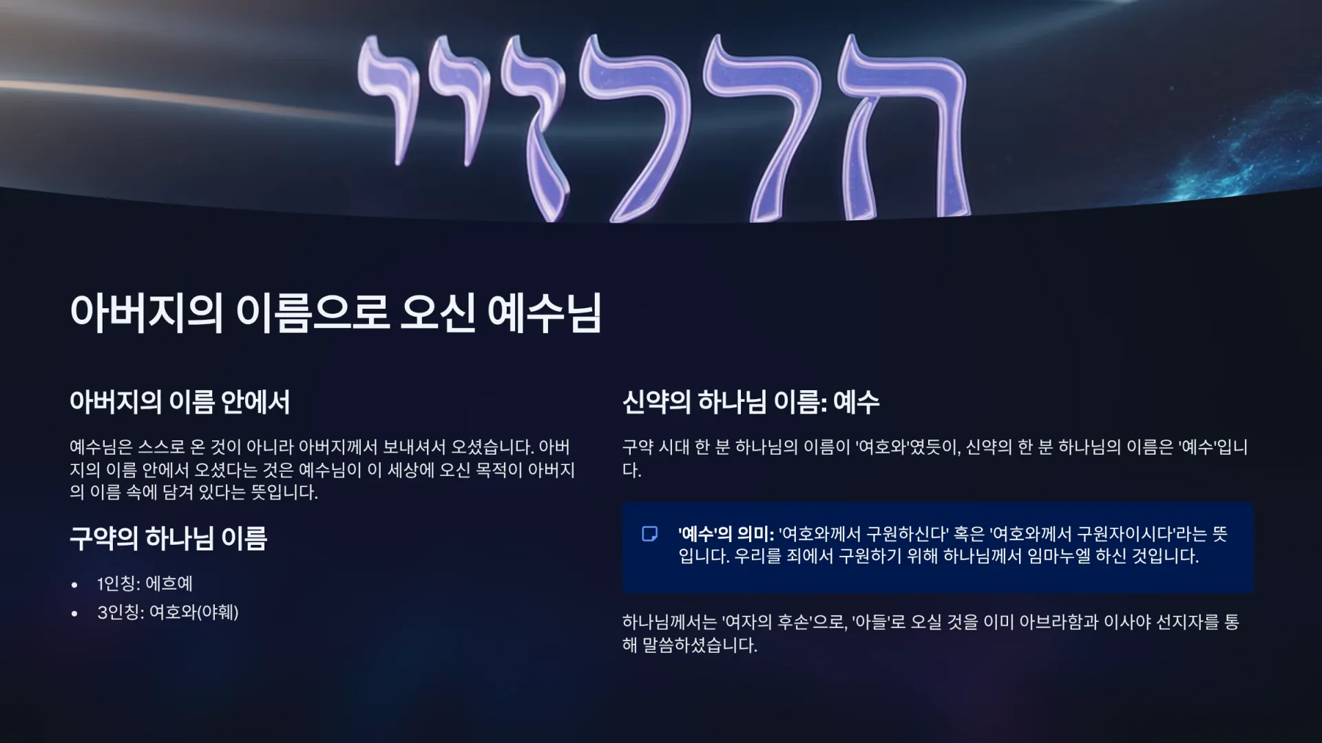 예수께서는 유대인들에게 말씀하시는 중에 예수 자신이 '아버지의 이름 안에서' 왔다고 말씀하셨다(요5:43). 예수께서는 스스로 온 것이 아니었기 때문이다. 아버지께서 보내셔서 오셨기 때문이다. 그러므로 예수께서는 한사코 아버지를 "나를 보내셨던 분"이라고 말씀하셨다. 그렇다면 예수께서는 대체 어떻게 아버지로부터 오셨다는 말인가? 그것은 아버지의 이름 안에서 오신 것을 가리킨다. 그렇다면, 예수께서 아버지의 이름 안에서 왔다는 말은 또 무슨 뜻인가? 그것은 예수께서 이 세상에 오신 목적이 아버지의 이름 속에 담겨 있다는 뜻이며, 예수께서는 그 일을 위해서 오셨다는 것이다. 그렇다면, 아버지의 이름 속에는 어떤 뜻이 담겨 있는가? 구약 시대에 아버지의 이름은 대체 무엇이었는가? 그것은 1인칭으로 보면, '에흐예'이시고, 3인칭으로 보면 '여호와(야훼)'이시다(출3:14~15). 그런데 아버지께서 인류를 구원하기 위해 아들을 보내셨다. 아니 실제로는 아들로 오신 것이다. 다시 말해 아버지께서 아들을 이 세상에 보내신 이유는 인류를 구원하기 위해 보내신 것이다. 그러므로 예수께서 아버지의 이름 안에서 왔다는 것은 하나님께서 여호와로서 인류를 구원하고자 왔다는 것을 의미한다. 그러므로 하나님의 새 이름이 바로 '예수'이신 것이다. 왜냐하면 구약 시대에 한 분 하나님의 이름이 '에흐예'이든지 '여호와(야훼)'였듯이, 신약의 한 분 하나님의 이름은 '예수'이기 때문이다. 왜냐하면 '예수'라는 이름의 뜻은 '여호와께서 구원하신다' 혹은 '여호와께서 구원자이시다'라는 뜻이기 때문이다. 우리 죄 많은 인간을 죄 가운데서 구원하기 위해 하나님께서 임마누엘 하신 것이다(마1:21~23). 그렇지만 유대인들은 하나님께서 아들로 오셨다는 것을 정말 모르고 있었다. 아니 그럴 것이라고 전혀 생각하지 않고 있었다. 하지만 이미 하나님께서는 '여자의 후손'으로(창3:15) 그리고 '아들'로 오실 것이라고 아브라함과 사라에게 직접적으로 말씀해 주셨을 뿐만 아니라(창18:10,14), 이사야 선지자에게 예언적으로 선포하도록 하셨다(사9:6). 그러나 오직 세상 사람들로부터 영광을 취하기 위해 혈안이 되어 있었던 그들은 구약 성경을 그토록 많이 보았지만 거기에 기록된 채 있는 아들을 발견하지 못했다.