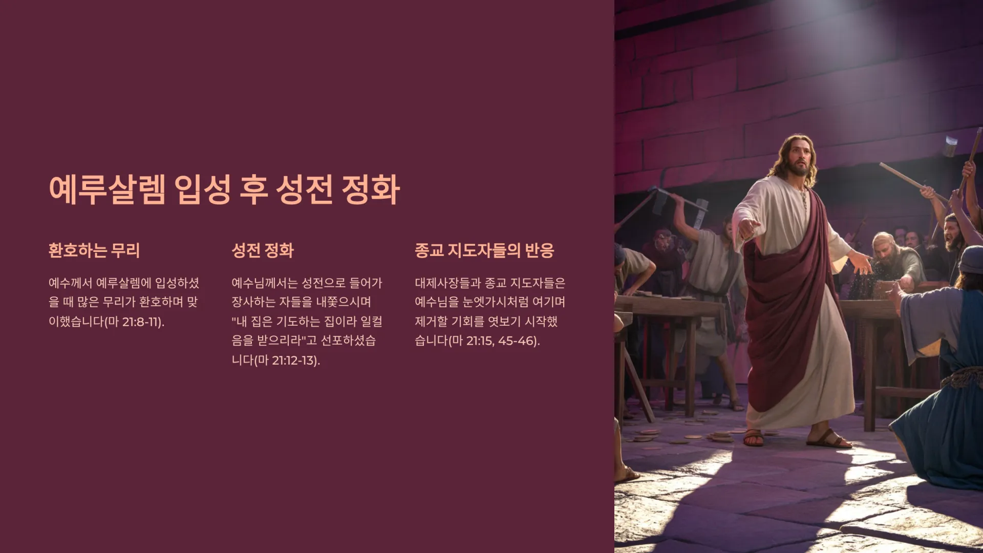 예수께서 예루살렘에 입성하셨을 때, 많은 무리가 환호하며 그분을 맞이했다(마 21:8-11). 그러나 예수님께서는 단순히 환호에 만족하지 않으시고, 곧바로 성전으로 들어가 장사하는 자들을 내쫓으시며 성전을 정화하셨다(마 21:12-13). “내 집은 기도하는 집이라 일컬음을 받으리라 하였거늘 너희는 강도의 소굴을 만드는도다.”(마 21:13) 예수님의 이 행동은 당시 성전 중심의 종교 체계를 이용하여 자신들의 이익을 추구하던 대제사장들과 종교 지도자들의 권위에 대한 정면 도전이었다. 그러자 그들은 예수님을 눈엣가시처럼 여겼고, 어떻게든 책잡아 제거할 기회를 엿보고 있었다(마 21:15, 45-46). 사람들은 이제 율법 해석이나 신앙 문제에 대해 서기관이나 바리새인들이 아닌 예수님께 나아와 묻기 시작했고, 이는 종교 지도자들의 시기심과 분노를 더욱 자극했다. 그들은 예수님을 합법적으로 제거하기 위해 산헤드린 공회에서 정죄할 빌미를 찾고자 혈안이 되었다.