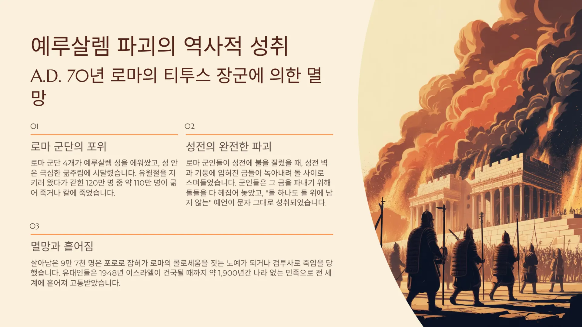 둘째, 파괴의 과정(역사적 성취)은 어떠했는가? 예수님의 예언대로 예루살렘은 A.D. 70년 로마의 티투스(디도) 장군에 의해 철저히 파괴되고 만다. 첫째로, 로마군단의 포위와 예루살렘의 굶주림을 보자. 로마 군단 4개가 예루살렘 성을 에워쌌고, 성 안은 극심한 굶주림에 시달렸다. 역사가 요세푸스에 따르면 당시 유월절을 지키러 왔다가 갇힌 120만 명 중 약 110만 명이 굶어 죽거나 칼에 죽었다고 한다. 굶주림에 지쳐 자식을 잡아먹는 참혹한 일까지 벌어졌다. 둘째로, 성전 파괴를 보자. 로마 군인들이 성전에 불을 질렀을 때, 성전 벽과 기둥에 입혀진 금들이 녹아내려 돌 사이로 스며들었다. 그러자 군인들은 그 금을 파내기 위해 돌들을 다 헤집어 놓았고, 그 결과 예수님의 말씀대로 “돌 하나도 돌 위에 남지 않고 다 무너뜨려지는”(마 24:2) 일이 문자 그대로 성취되고 말았다. 셋째로, 멸망과 흩어짐을 보자. 살아남은 9만 7천 명은 포로로 잡혀가 로마의 콜로세움을 짓는 노예가 되거나 검투사로 죽임을 당했다. 이후 유대인들은 1948년 이스라엘이 건국될 때까지 약 1,900년간 나라 없는 민족으로 전 세계에 흩어져 고통받았다.