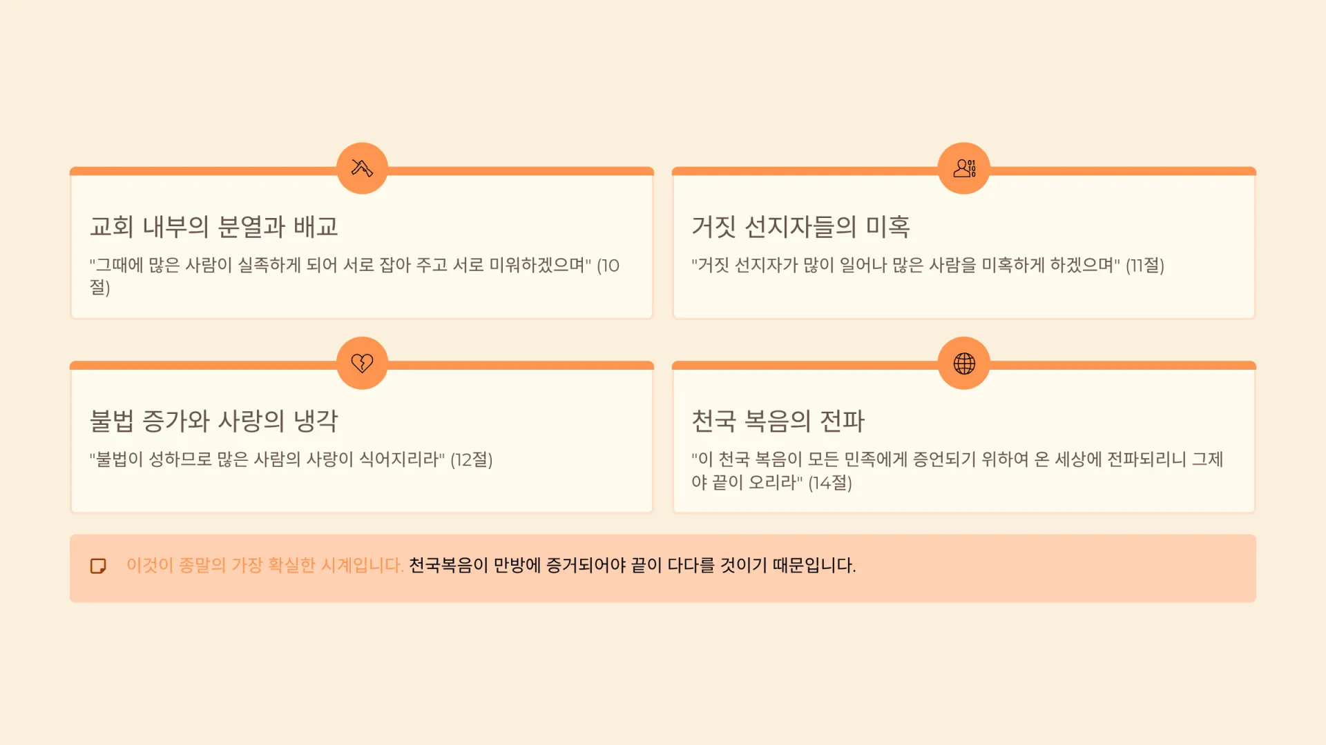 다섯째, 교회 내부의 분열과 배교가 있을 것이다. “그때에 많은 사람이 실족하게 되어 서로 잡아 주고 서로 미워하겠으며... 불법이 성하므로 많은 사람의 사랑이 식어지리라”(10, 12절). 교회 안에서도 사랑이 식고 서로를 고발하며 배교하는 일이 일어난다.
