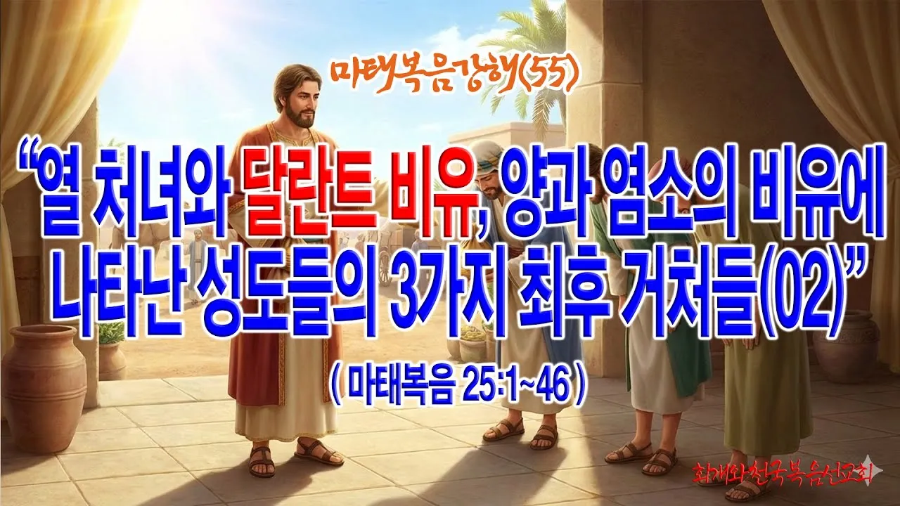 제목: [마태복음강해(55)] 열 처녀와 달란트 비유, 양과 염소의 비유에 나타난 성도들의 3가지 최후 거처들(02)(마25:1~46)_동탄명성교회 정보배 목사