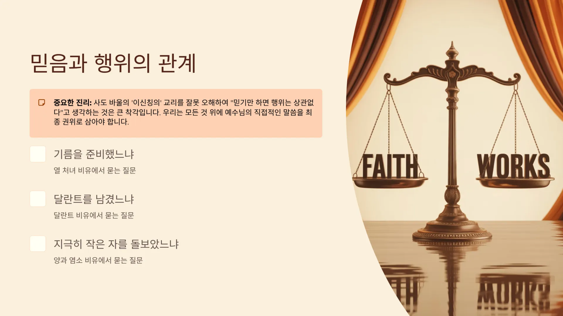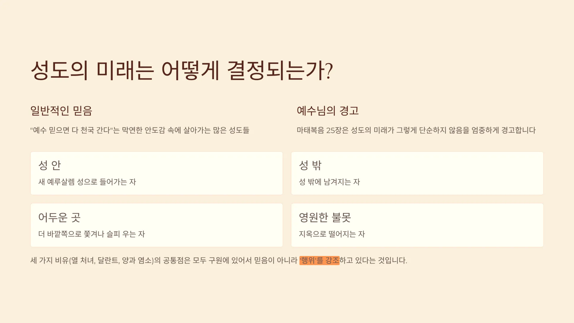성도들이 죽게 되면 그들은 어디로 가는가? 이 부분에 대한 기존의 생각은 무엇이며, 우리 주 예수께서는 이에 대한 무엇이라고 말씀하셨는가? 그래서 이번 시간에는 지난주에 이어 마태복음 25장에 나타난 성도들의 최후 거처에 대해 좀더 깊이 살펴보고자 한다. 많은 성도가 "예수 믿으면 다 천국 갈 것이다"는 막연한 안도감 속에 살아가고 있다. 그러나 예수님은 마태복음 25장을 통해 우리의 미래가 그렇게 단순하지 않음을 엄중하게 경고하셨다. 왜냐하면 성도라도 성 안(새 예루살렘 성)으로 들어가는 자가 있고, 성 밖에 남겨지거나 성의 더 바깥쪽 어두운 곳으로 쫓겨나 슬피 우는 자가 있을 것이며, 심지어 영원한 불못(지옥)으로 떨어지는 자도 있다고 말씀하셨기 때문이다. 이것이 바로 마태복음 25장에 나오는 이 천국의 세 가지 비유(열 처녀, 달란트, 양과 염소)이다. 그런데 이 비유의 특징은 모두 다 구원에 있어서 믿음이 아니라 '행위'를 강조하고 있다는 것이다. 즉 기름을 준비했느냐, 달란트를 남겼느냐, 지극히 작은 자를 돌보았느냐를 질문하고 있는 것이다. 그러므로 사도 바울의 '이신칭의' 교리를 잘못 오해하여 "믿기만 하면 행위는 상관없다"고 생각하는 것은 큰 착각이다. 바울 역시 훌륭한 하나님의 종이지만, 우리는 바울의 주장을 과대해석하는 우를 범하지 말아야 한다. 우리는 모든 것 위에 예수님의 직접적인 말씀을 최종 권위로 삼아야 한다. 그래서 이번에는 마태복음 25장의 3가지 비유 말씀들을 통해 내 영혼의 현주소를 점검하고, 후회 없는 영원한 미래를 준비하는 지혜를 얻기를 간절히 바란다.