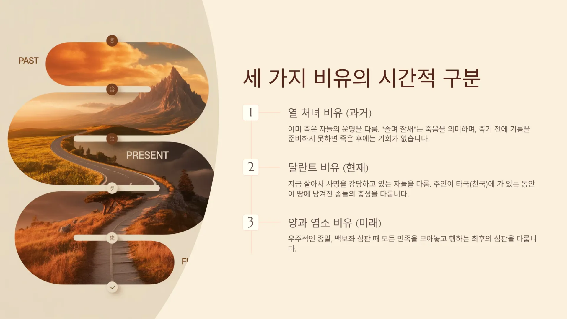 둘째, 이 비유들은 시간적으로 구분하여, 과거, 현재, 미래의 상태로 나눌 수 있다. 첫째로, 열 처녀 비유(과거)를 보자. 이 비유는 이미 죽은 자들의 운명을 다루고 있다. "졸며 잘새"라는 표현은 죽음을 의미하기 때문이다. 죽기 전에 기름을 준비하지 못하면, 죽은 후에는 기회가 없다는 사실을 알아야 한다. 둘째로, 달란트 비유(현재)를 보자. 이 비유는 지금 살아서 사명을 감당하고 있는 자들을 다룬다. 주인이 타국(천국)에 가 있는 동안, 이 땅에 남겨진 종들이 어떻게 충성하고 있는지를 다루고 있는 것이다. 이번 시간에 우리가 집중해서 다뤄볼 부분이다. 셋째로, 양과 염소 비유(미래)를 보자. 이 비유는 우주적인 종말, 즉 백보좌 심판 때 모든 민족을 모아놓고 행하는 최후의 심판을 다룬다. 이것은 다음 시간에 다루게 될 것이다.