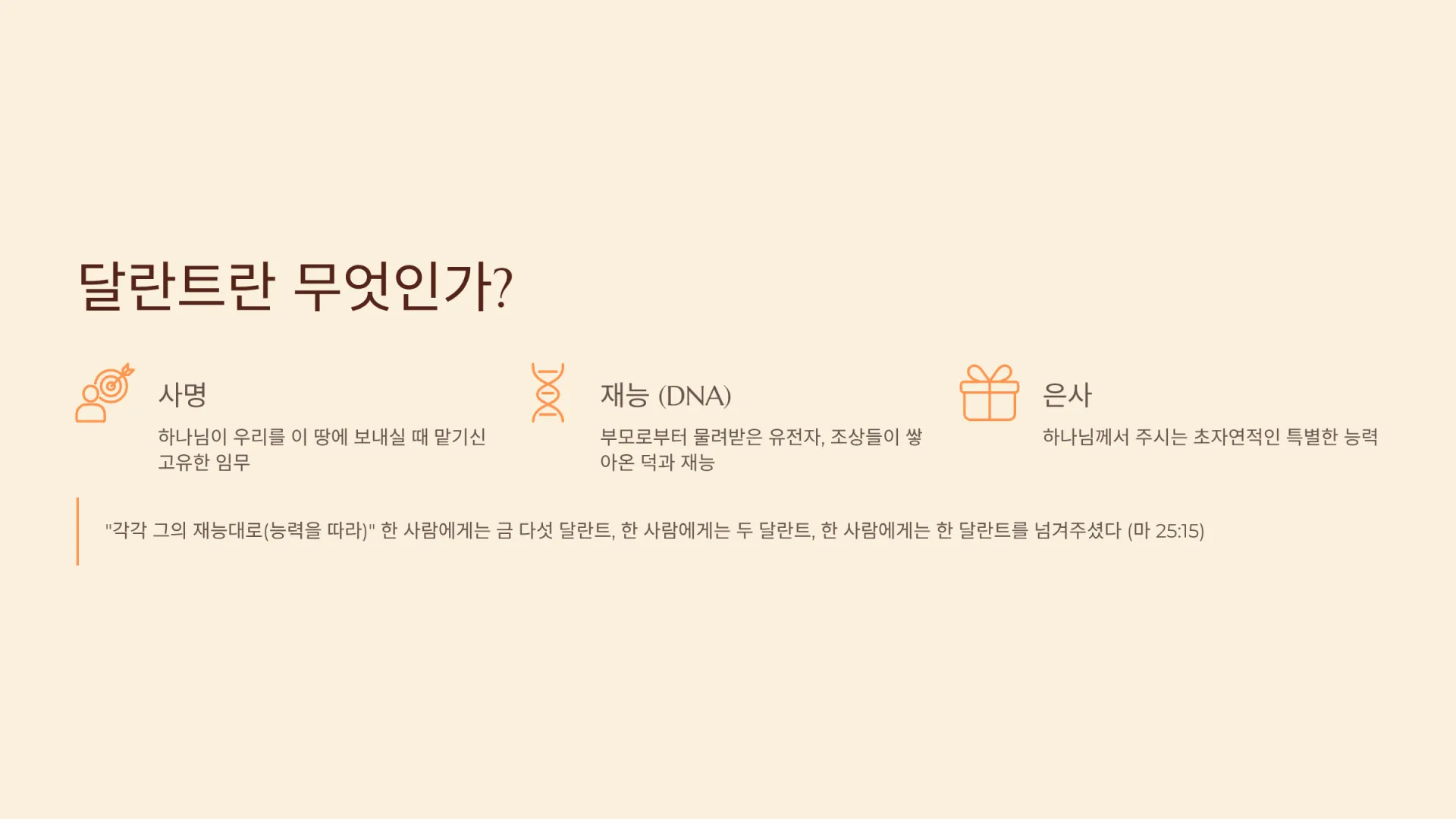 달란트 비유에서 주인이 종들에게 맡긴 '달란트'는 무엇을 의미하는가? 그것은 크게 3가지로 해석할 수 있다.