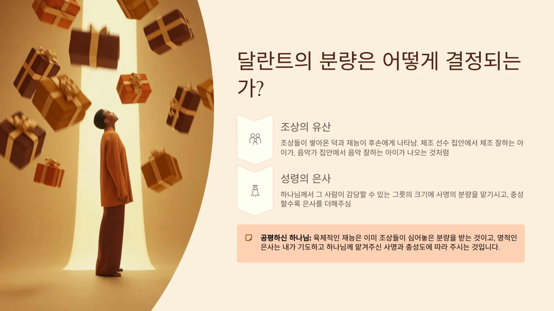 그런데 이 비유에서 주인이신 예수께서는 자신의 종들을 불러서 그들에게 "각각 그의 재능대로(능력을 따라)" 한 사람에게는 금 다섯 달란트, 한 사람에게는 두 달란트, 한 사람에게는 한 달란트를 넘겨주셨다고 말씀하고 있다(마 25:15). 얼핏 보기에는 하나님께서 사람을 차별하는 것이 아닌가 생각할 수도 있다. 불공평하다고 생각할 수도 있는 것이다. 그러나 사실 속으로 깊이 들어가보면그렇지 않다. 그것은 육체적인 재능은 이미 조상들이 심어놓은 분량을 내가 먹는 것이고, 영적인 은사는 내가 기도하고 하나님께서 나에게 맡겨주신 사명과 충성도에 따라 하나님께서 주시는 것이기 때문이다.