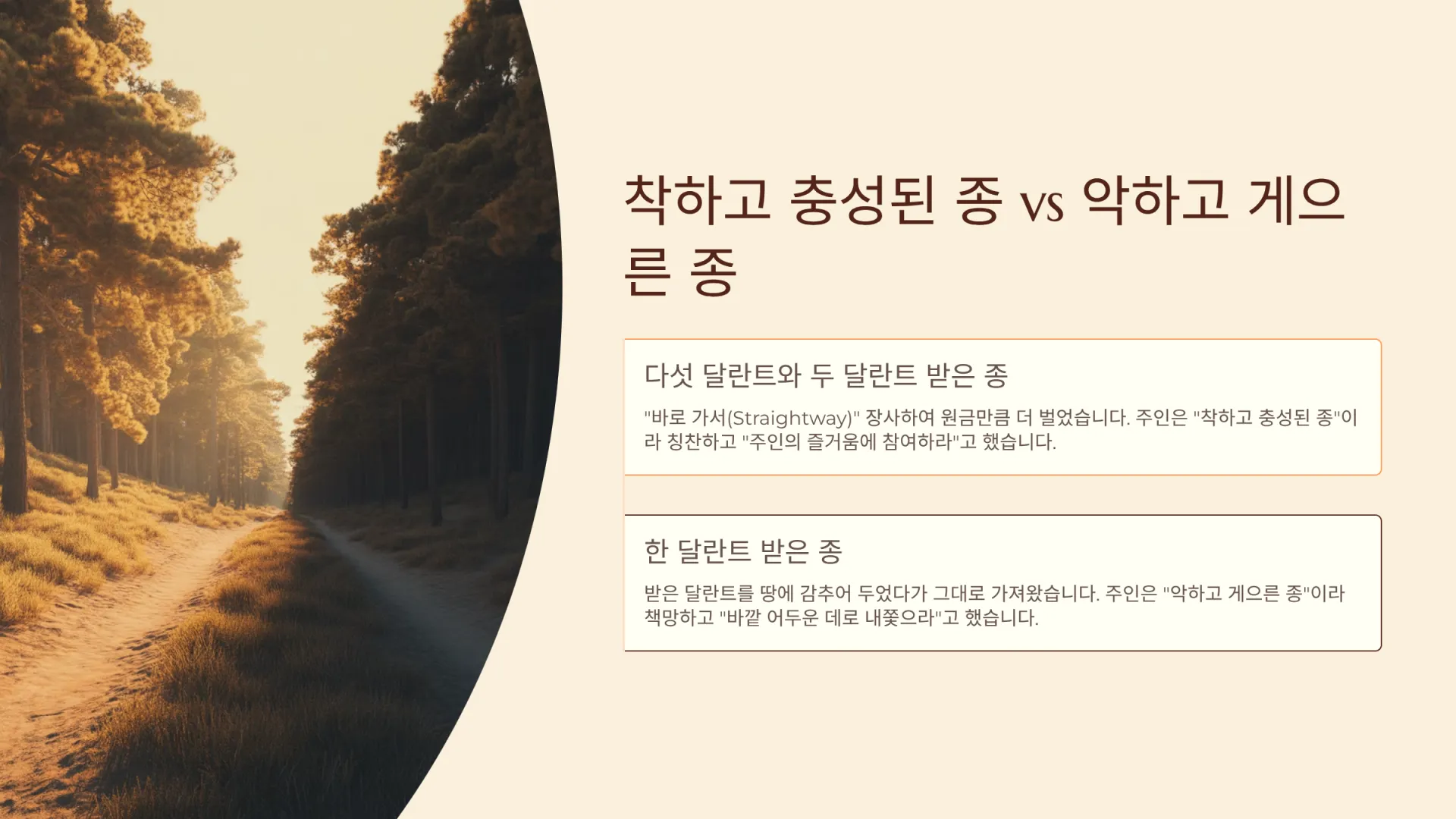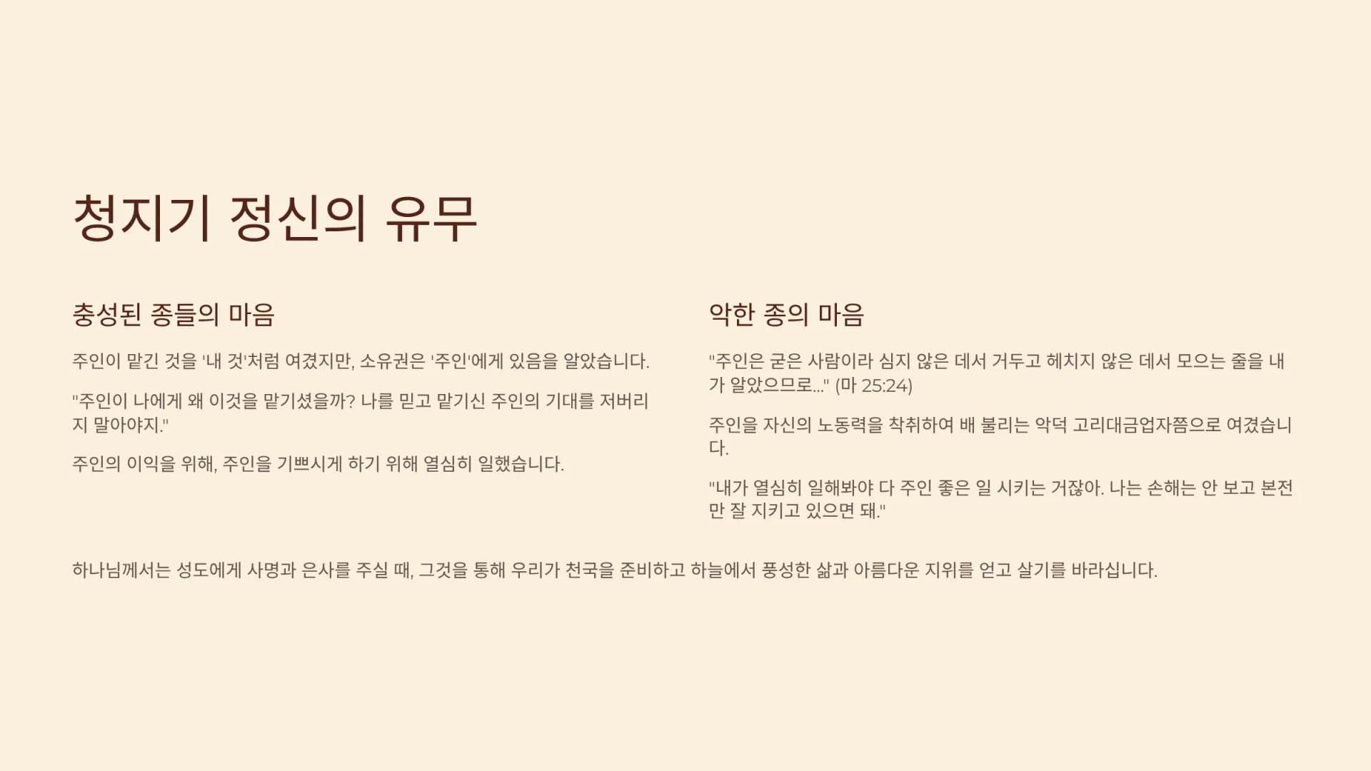 4. 착하고 충성된 종과 악하고 게으른 종의 차이는 무엇인가? ('청지기 정신'의 유무)
