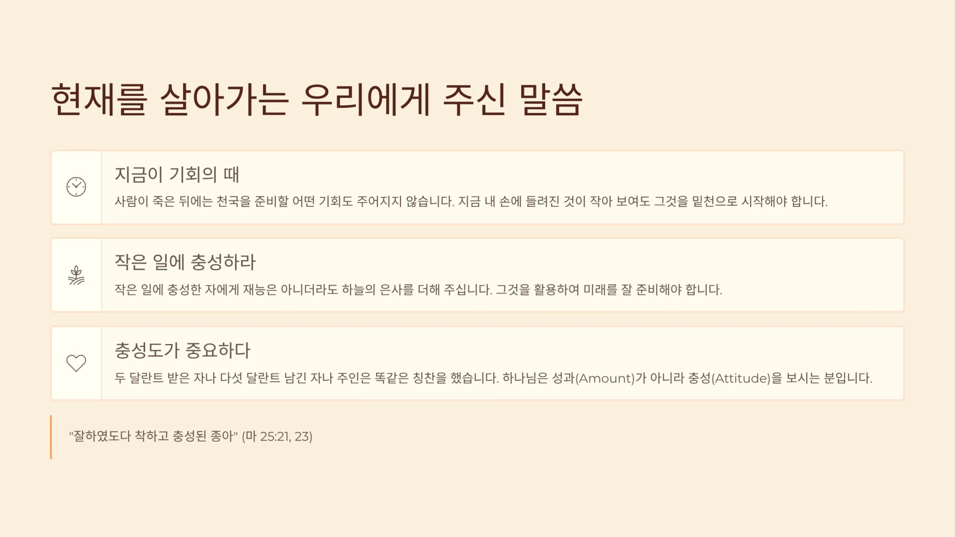 고로 달란트 비유는 '현재'를 살아고 있는 우리 성도들이자 특히 주의 종들에게 주시는 말씀이다. 그러나 열 처녀의 비유에서도 말씀드렸지만 사람이 죽은 뒤에는 천국을 준비할 어떤 기회도 주어지지 않는다는 것을 알아야 한다. 지금 내 손에 들려진 것이 작아 보인다고 할지라도 그것을 밑천으로 하여 시작해야 한다. 그러면 작은 일체 충성한 자에게 재능은 아니더라도 하늘의 은사를 더해 주신다. 그러면 우리는 그것을 활용하여 내 미래를 잘 준비해야 한다. 이를 위해서 우리에게 필요한 것은 부지런히 일하는 것이고 충성하는 것이다.