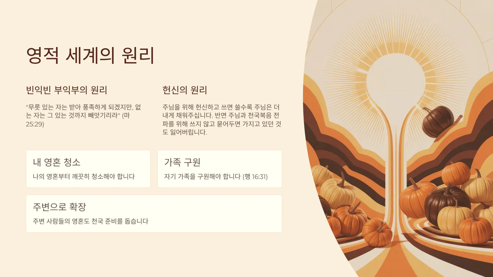 그리고 기억할 것은 두 달란트 받은 자나 다섯 달란트 남긴 자나 주인은 똑같은 칭찬을 했다는 것을 기억하라(마 25:21, 23). 하나님은 성과(Amount)가 아니라 충성(Attitude)을 보시는 분이시다. 남과 비교하지 말라. 내게 주신 분량 안에서 최선을 다하면 되는 것이다. 남이 그만한 일을 할 수 있게 된 것은 이미 그가 조상들이 심어놓은 땀과 희생과 눈물의 댓가를 받고 있기 때문이다. 그러나 내가 조상으로부터 받은 것이 없다고 실망할 필요는 없다. 왜냐하면 지금이라도 우리가 주의 일에 충성하면 나도 천국을 더 잘 준비할 수 있도록 하늘의 신령한 은사를 더 주시기 때문이다. 그러나 작게 받았다고 늘 불평과 불만 속에서 살아가는 자는 얻는 것도 없다는 것을 알아야 한다. 오히려 심판 때에 자신이 가지고 있던 것마저 빼앗기고 만다는 것을 기억하라. 영적인 세계에서는 지금도 빈익빈 부익부의 영적 원리가 작동하고 있다. "무릇 있는 자는 받아 풍족하게 되겠지만, 없는 자는 그 있는 것까지 빼앗기리라"(마 25:29)고 말씀하고 있다. 주님을 위해 헌신하고 쓰면 쓸수록 주님은 더 내게 채워주시는 분이라는 것을 기억하자. 반면 주님과 천국복음 전파를 위해서 쓰지 않고 아끼고 묻어두고 있으면 자신이 가지고 있던 것도 그만 잃어버리게 된다는 것을 기억하자.