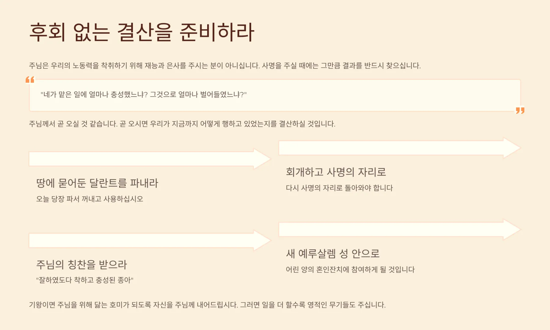 주님은 우리의 노동력을 착취하기 위해 재능과 은사를 주시는 분이 아니시다. 그리고 사명을 주실 때에는 그만큼 결과를 반드시 찾으신다는 것도 알아야 한다. 누구는 많이 받았다고 부러워할 일이 아니다. 감당하지도 못하는 것을 사모하다가 아무 것도 하지 않아 책망받을 필요가 없다. 주님은 많은 사명을 맡긴 자에게는 많이 찾으실 것이라고 했다. 그러나 적게 맡은 자는 적은 것만 주님께 돌려드리면 된다. 그래서 착하고 충성된 자가 될 수 있는 것이다. 주님께서 곧 오실 것 같다. 곧 오시면 우리가 지금까지 어떻게 행하고 있었는지를 결산하실 것이다. 그때 주님께서 우리에게 "네가 맡은 일에 얼마나 충성했느냐? 그것으로 얼마나 벌어들였느냐?"라고 물으실 때, 우리는 어떻게 대답하고 무엇을 내놓을 것인지를 준비해야 한다. 녹슨 호미로 자신을 방치할 것인가, 아니면 닳아 없어진 호미가 되어 오늘도 새 호미를 주시는 하나님을 경험할 것인가는 우리가 결정하는 일이다. 기왕이면 주님을 위해 닳는 호미가 되도록 자신을 주님께 내어드려야 한다. 그러면 일을 더 할수록 영적인 무기들도 주신다. 그러므로 기왕이면 우리도 착하고 충성된 사람이 되어보자. 주님께 성실하게 쓰임 받는 일꾼이 되어보자. 그래서 그날 영광스럽게 주님 앞에 서도록 하자. 땅에 묻어둔 달란트가 있다면 오늘 당장 파서 꺼내라. 그리고 그것을 사용하라. 회개하고 다시 사명의 자리로 돌아와야 한다. 그리하여 훗날 주님 앞에 섰을 때, 우리도 역시 "잘하였도다 착하고 충성된 종아"라는 칭찬을 듣게 될 것이다. 그리고 새 예루살렘 성 안에 들어가서 어린 양의 혼인잔치에 참여하게 될 것이다. 그리로 그들 중의 어떤 이는 영광스러운 보좌에 앉아 만국을 다스리는 사람이 되어있을 것이다.